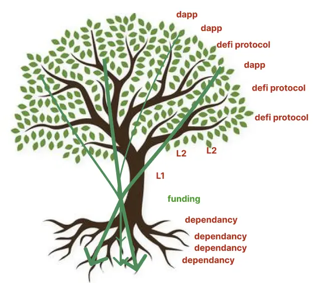 从宏观角度来看,PGF 架构呈现多中心化特征:每个 L2 层、应用链和协议都为其自身的依赖项提供资金,这些资金像菌丝体一样向外扩散。