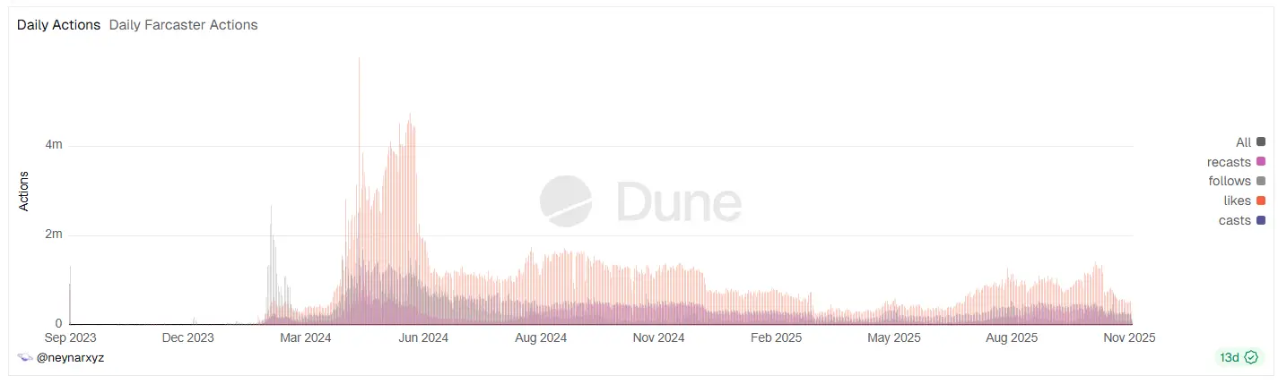 进入 2025 年,情况继续恶化,社交侧日活一度再降近 40%,直到 10 月推出 USDC 存款 10% 奖励活动,才依靠钱包功能把整体日活拉回到 5 万至 6 万区间。