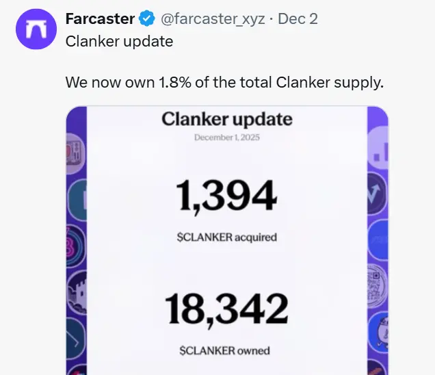 • 资产发行:通过收购代币发行平台 ClankerFarcaster 为钱包核心战略配备了资产发行能力,现持有 Clanker 总供应量的 1.8%