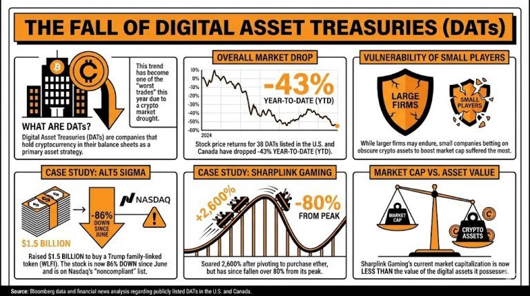 Smaller DATs that invested in obscure cryptocurrencies, like Alt5 Sigma, have faced severe losses, with some companies down over 80% from their peaks.What implications does this decline have for the broader cryptocurrency market?