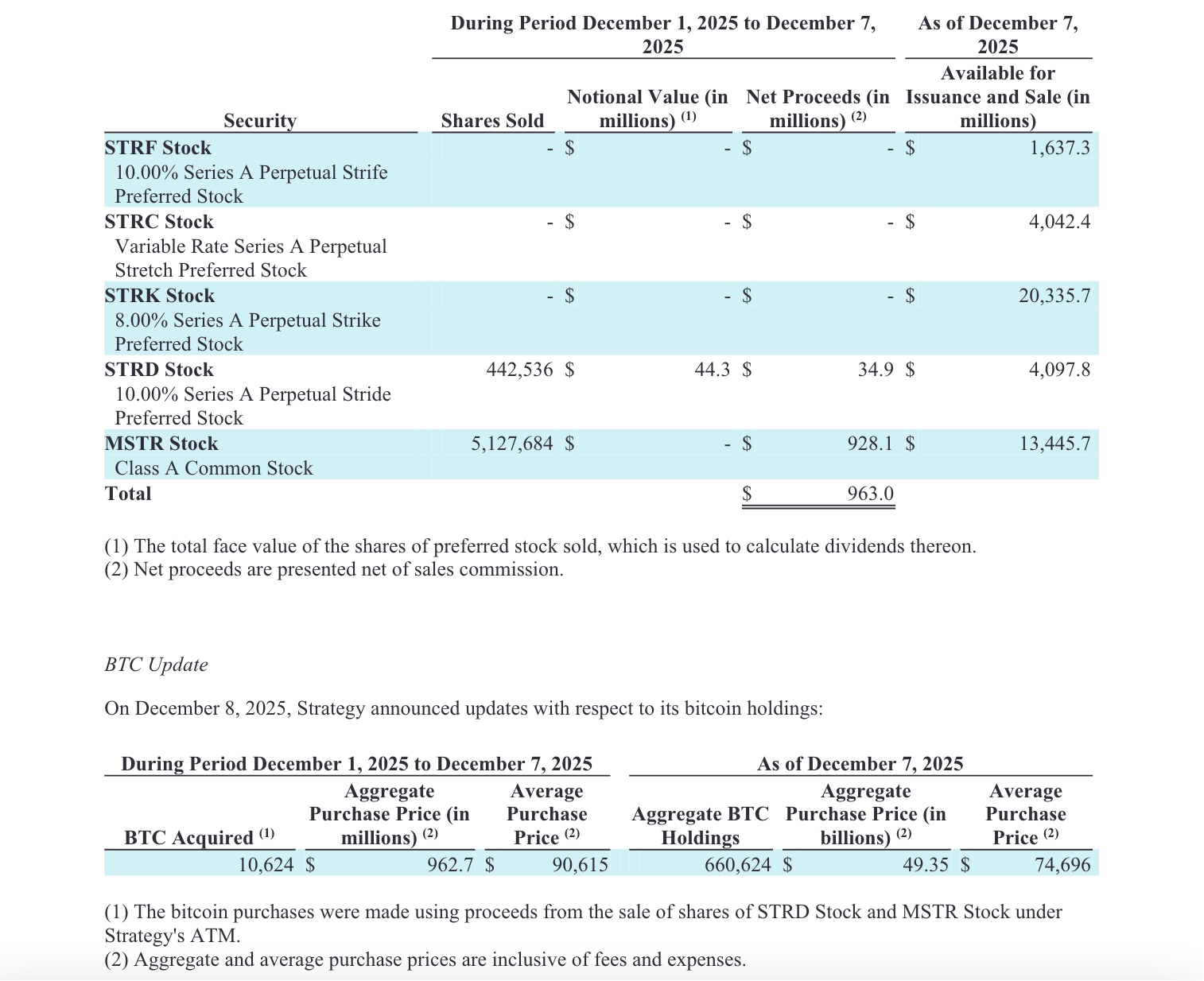 据 Strategy 向美 SEC 提交的 Form 8-K 文件,截至 2025 年 12 月 7 日,Strategy 共持有 660,624 枚比特币,累计成本约 493.5 亿美元,平均成本约 74696 美元/枚。比特币年化收益率(YTD 2025)已达到 24.7%。该项购币资金来自公司在 ATM 融资中出售 STRD 及 MSTR 股票所得。