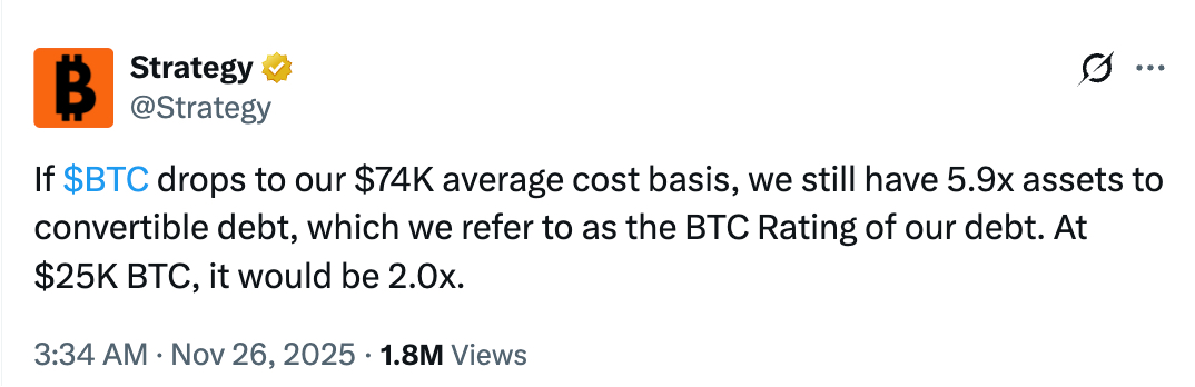 Strategy 发推表示,即使比特币跌至其 7.4 万美元平均成本价,其 BTC 资产仍为可转换债务的 5.9 倍。Strategy 创始人 Michael Saylor 也在参加活动时进一步强调,「Strategy 目前有大约 600 亿美元的比特币储备和约 80 亿美元的债务,这是一个相当低的杠杆比率。」