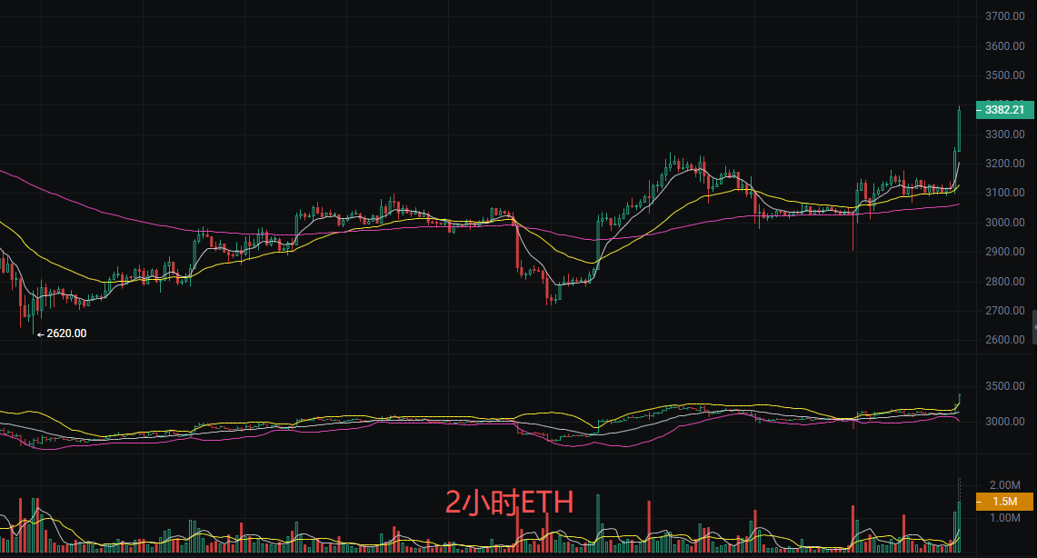 2小时明显的上涨趋势,形成多根大阳线,最高3397强劲买盘力量。日线连续三天收阳突破前期高点3124加速上涨阶段。MACD2小时短期多头占据主导;日线多头动能增强。EMA2小时均呈现多头排列日线亦呈现多头排列,支撑较强,思路上很明确,低位多有效,稳健的币友可以在目前这个位置获利了结等回调以后再进