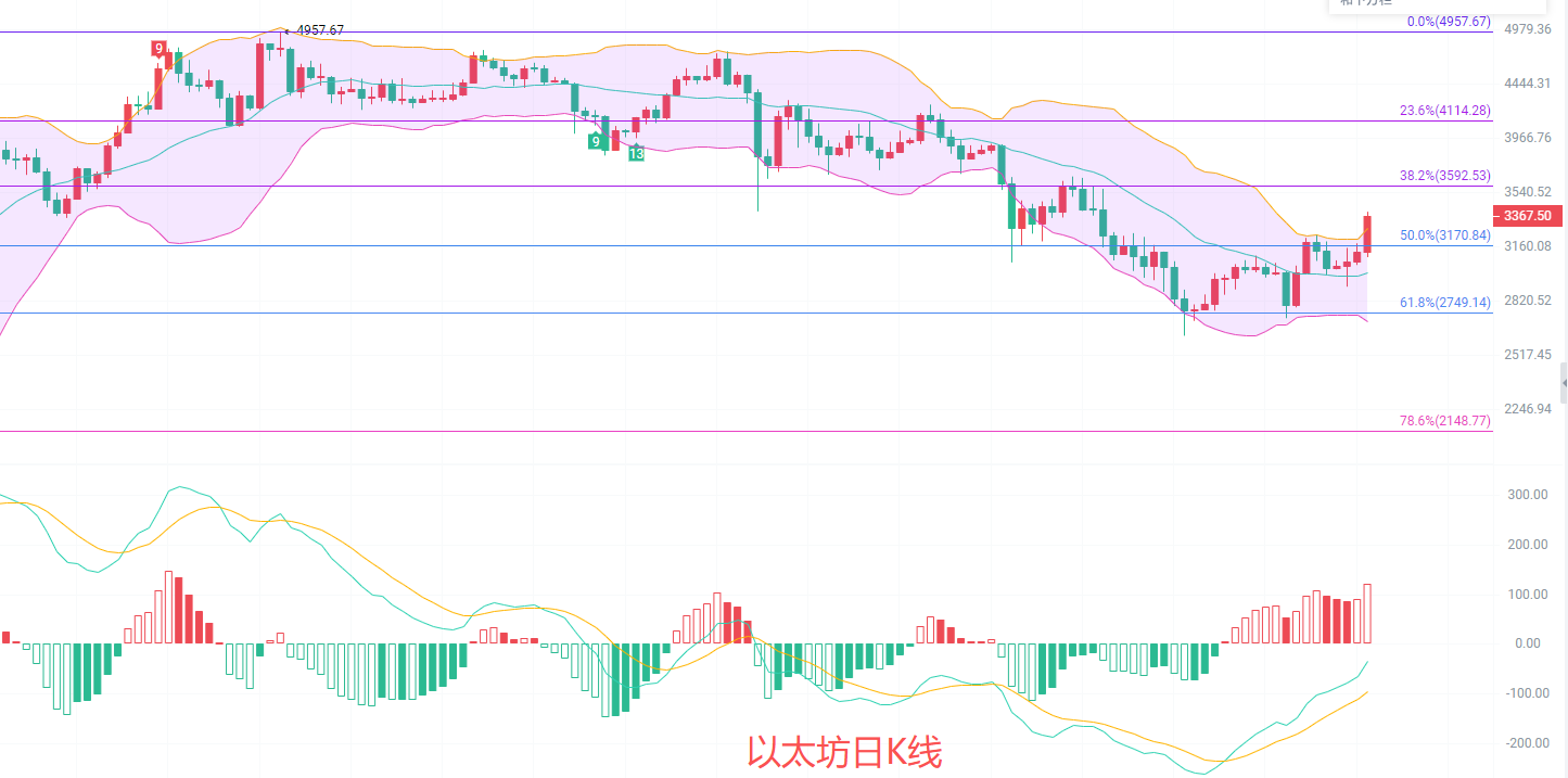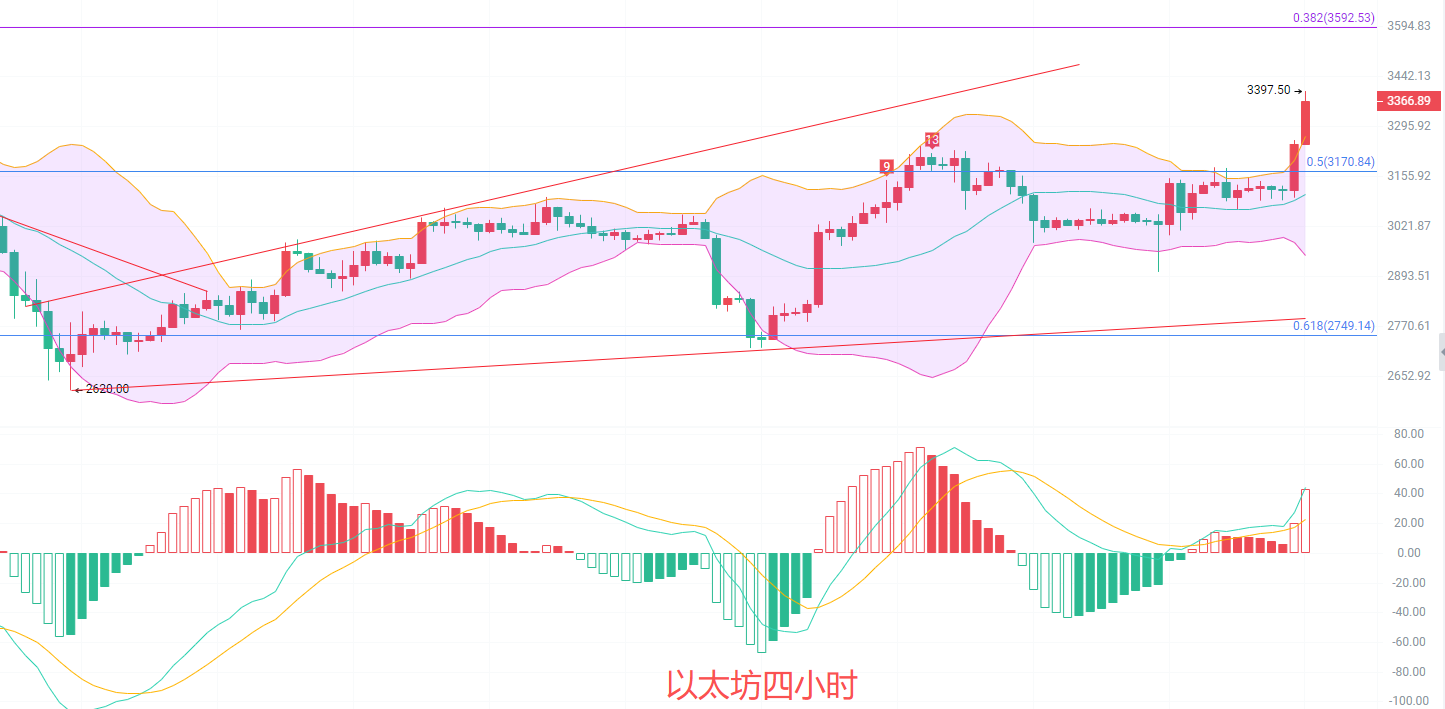 日K线发稿前最高3397,最低3089,EMA趋势指标向上收缩形成多头趋势,K线连续四天阳线上拉,都是站立EMA15一线3088向上发力,MACD放量增筹,DIF和DEA来到了0轴线附近,K线破了布林带上轨3286,整体趋势上可以以上轨为支撑,尤其是没有上车的回调上轨支撑北上