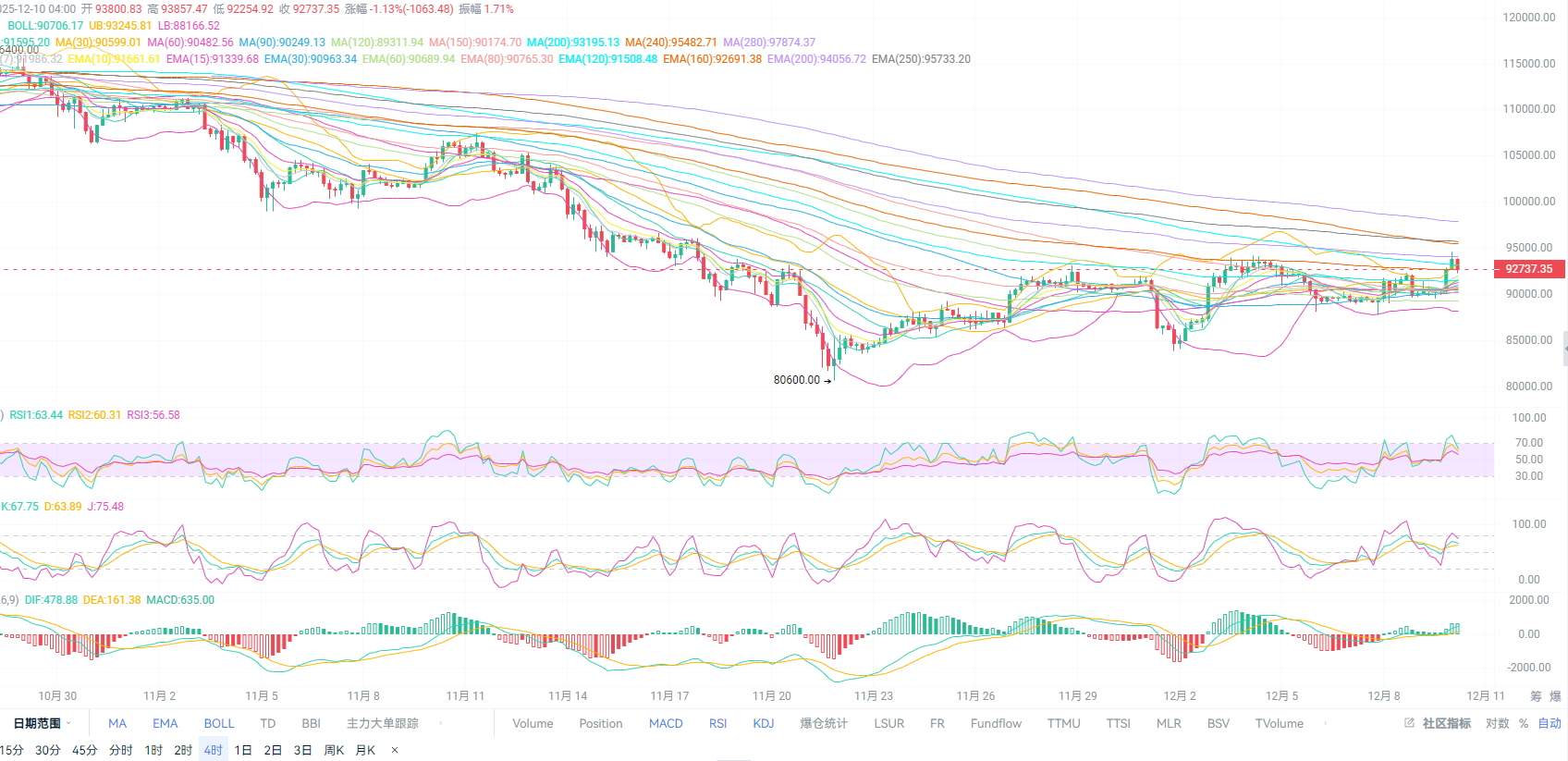 比特币现价92700附近。晚间行情冲击4H级别EMA200上方后形成严重超买后再次展开回落,目前k线下行接近EMA160位置,BOLL通道为开口形态,并没有一味向上,说明下方空间也是存在的,RSI三线呈现顶部拐头向下接近55,KDJ三线也是收口向下,短期下方关注需关注EMA120与中轨区间可作为回踩支撑,上方需看二探EMA200与前高区间压力可上看到EMA250位置。
