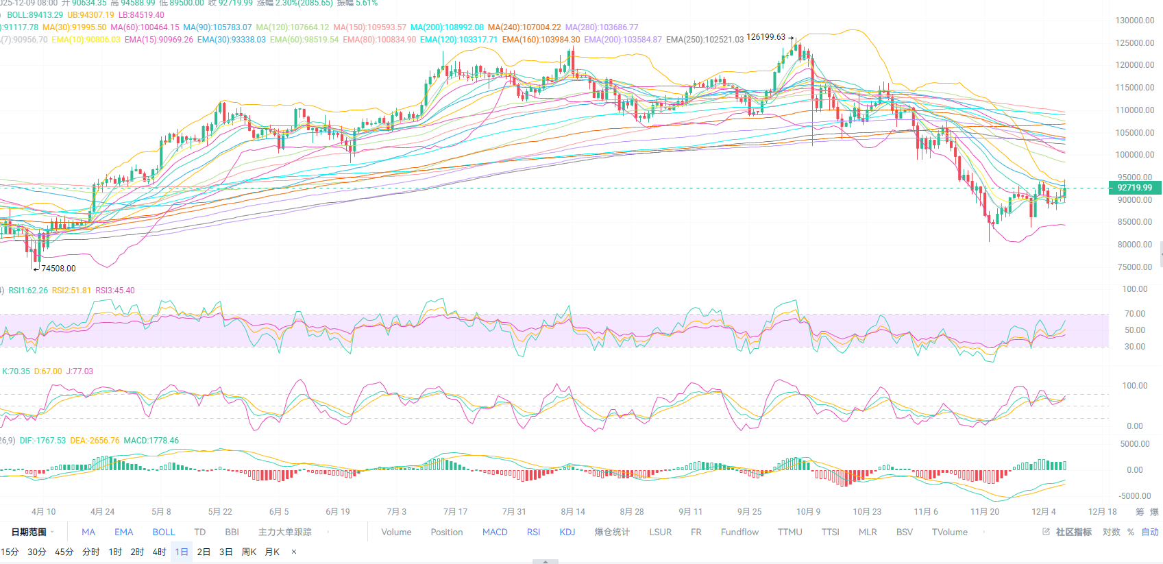 币圈红姐12.10:比特币日线上轨受压短期95000成空头重要防守!今日比特币(BTC)最新行情分析与操作建议!