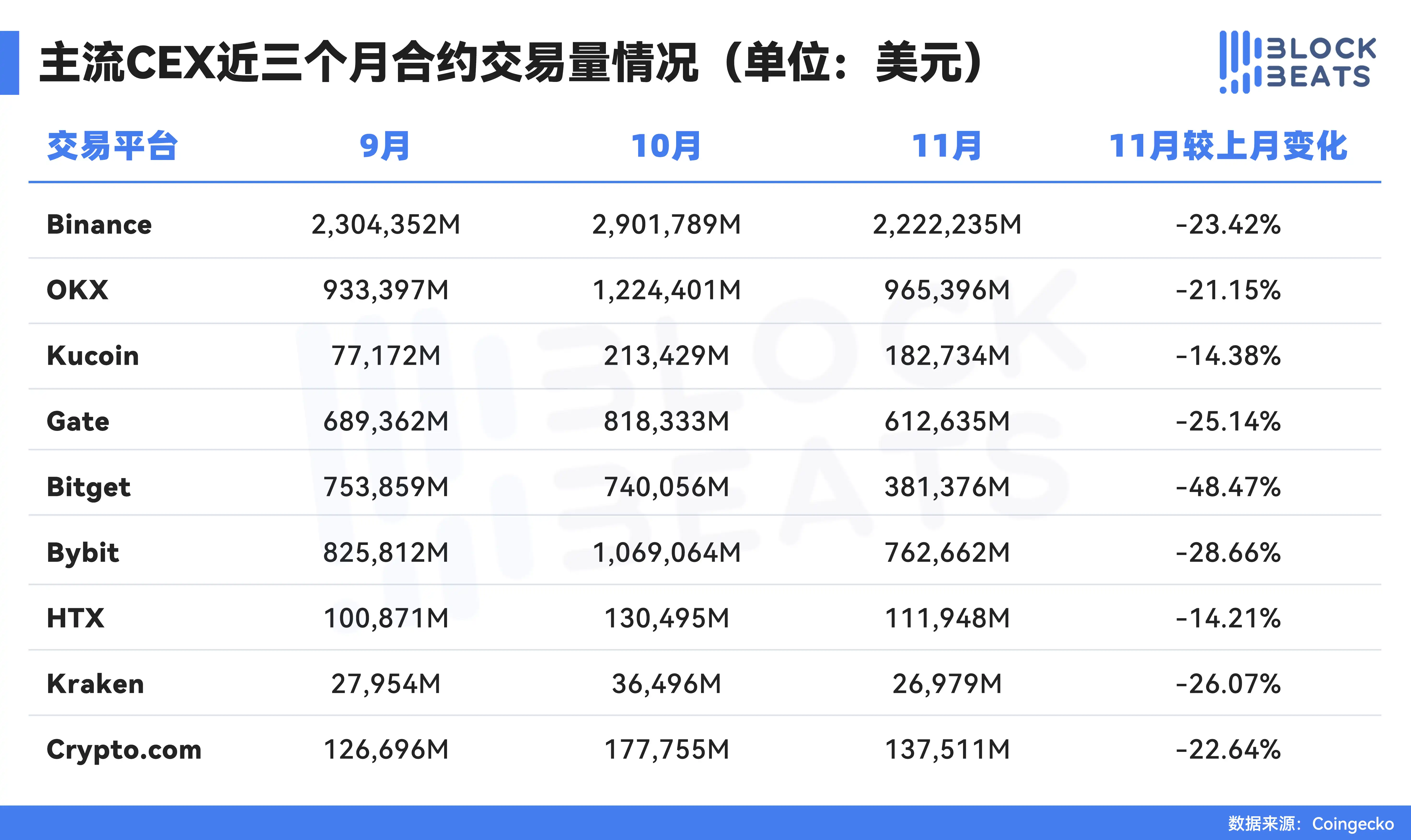 In November 2025, the spot trading volume of mainstream CEXs decreased by 27% compared to October. The top three in terms of change rate are Coinbase -5.42%, Kucoin -16.50%, and Crypto.com -17.72%. The bottom three are OKX -27.18%, Bybit -31.42%, and Gate -43.91%.