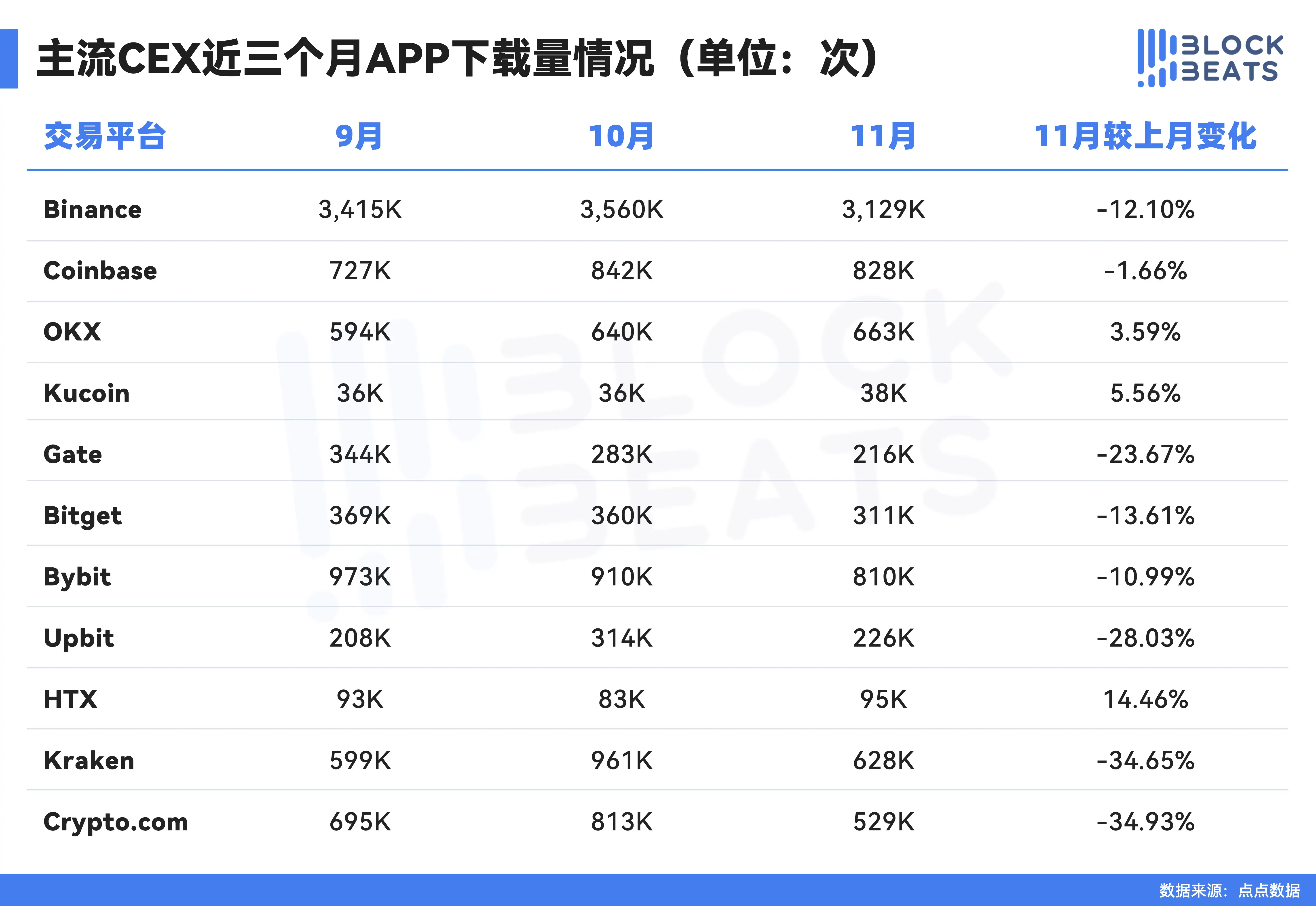 In November, the website download volume of mainstream CEXs decreased by 15% compared to October. The top three in terms of change rate are HTX 14.46%, Kucoin 5.56%, and OKX 3.59%. The bottom three are Upbit -28.03%, Kraken -34.65%, and Crypto.com -34.93%.
