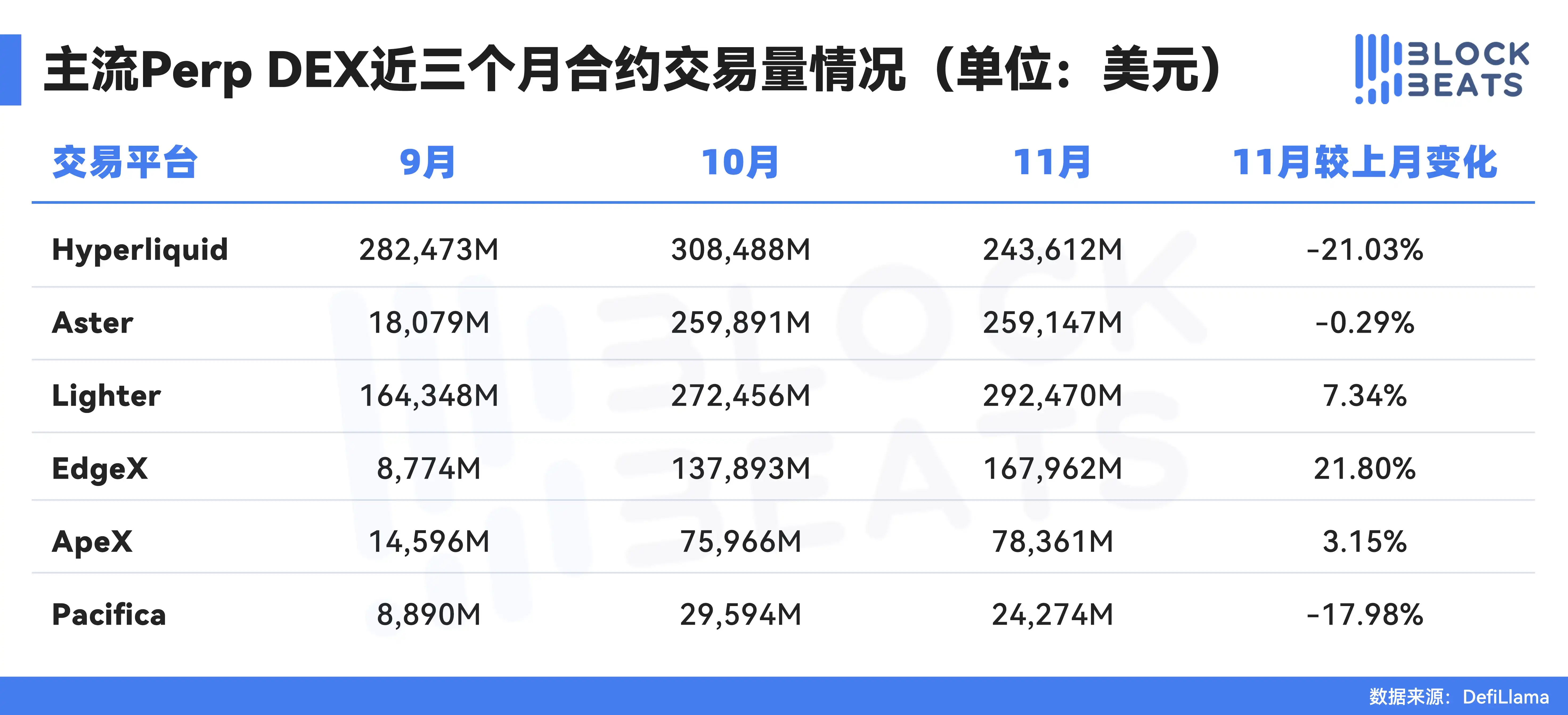 In November, the perpetual contract trading volume of mainstream Perp DEXs decreased by 1.70%, and website traffic decreased by 35.5% compared to October.