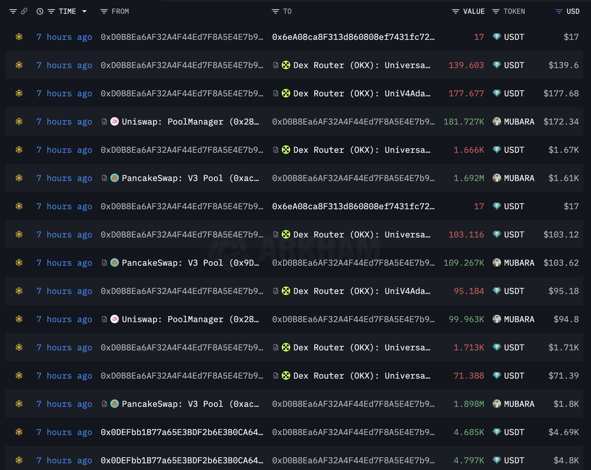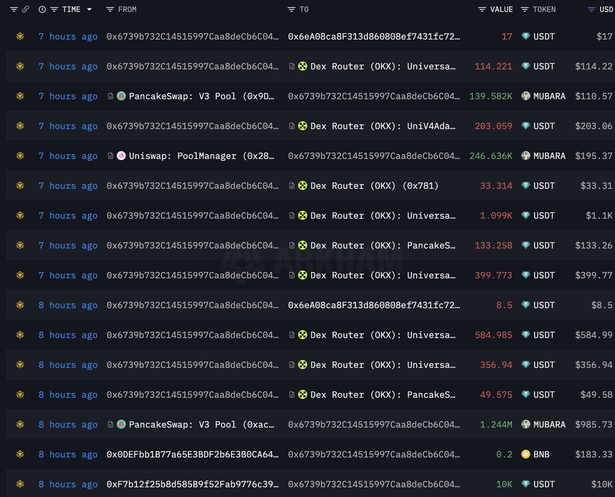黑客在大约 7 小时前创建了 2 个新钱包(0x6739 和 0xD0B8),并花费 19,479 $USDT 购买了 21.16M $Mubarakah。