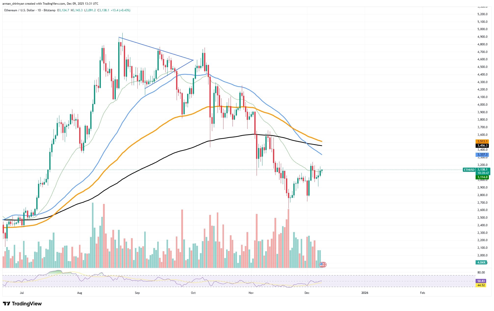 50日和100日移动平均线的压制目前正在影响ETH。这个集群在$3,250到$3,350之间形成了一个强大的阻力区域,而ETH正有效地烧毁它,通过不断向上冲击并拒绝进行重大回撤。在大多数情况下,表现出这种行为的资产正准备突破,而不是下跌。