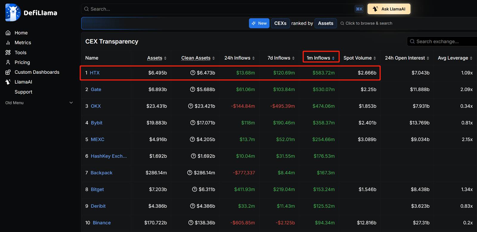 火币HTX凭借资产透明化、C2C体验升级和安全合规策略,实现了行业领先的资金净流入,Defillama数据显示过去30天净流入达$583.7M,排名所有CEX第一,证明用户信任度显著回升。