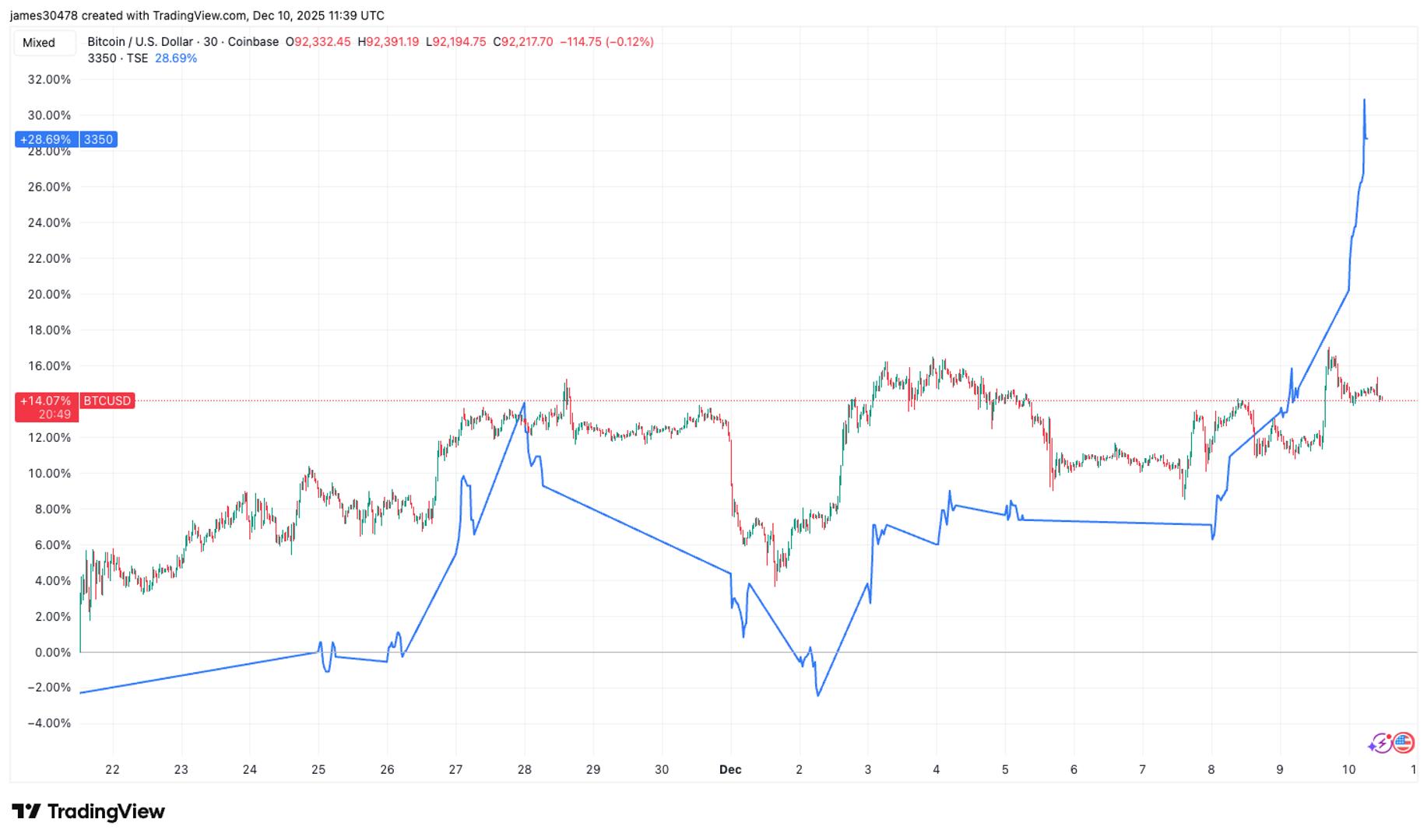 自11月21日比特币接近8万美元的低点以来,该资产上涨了约15%,而Metaplanet的股价在同一时期上涨了近30%。