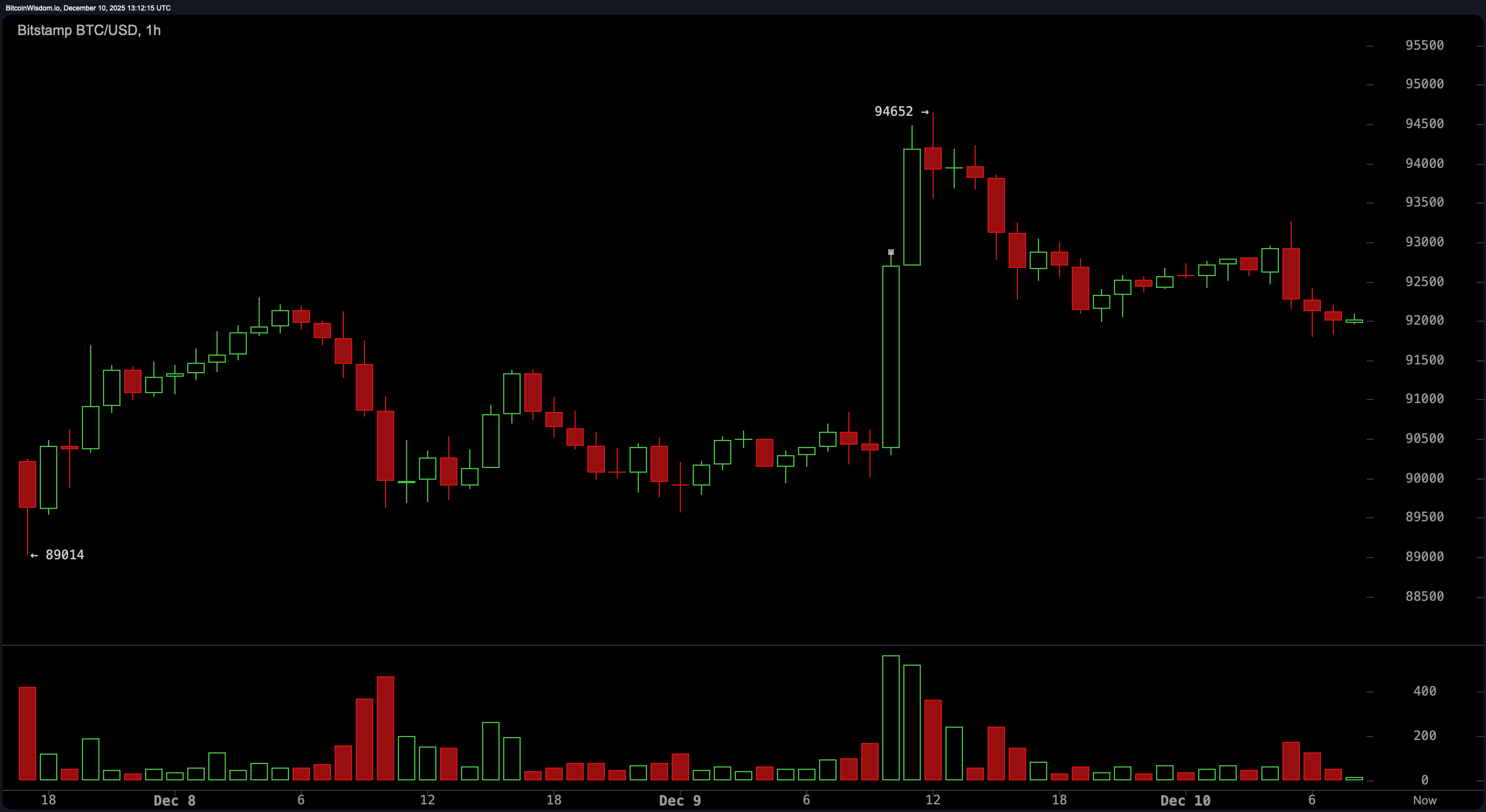 2025年12月10日通过Bitstamp的BTC/USD 1小时图表。