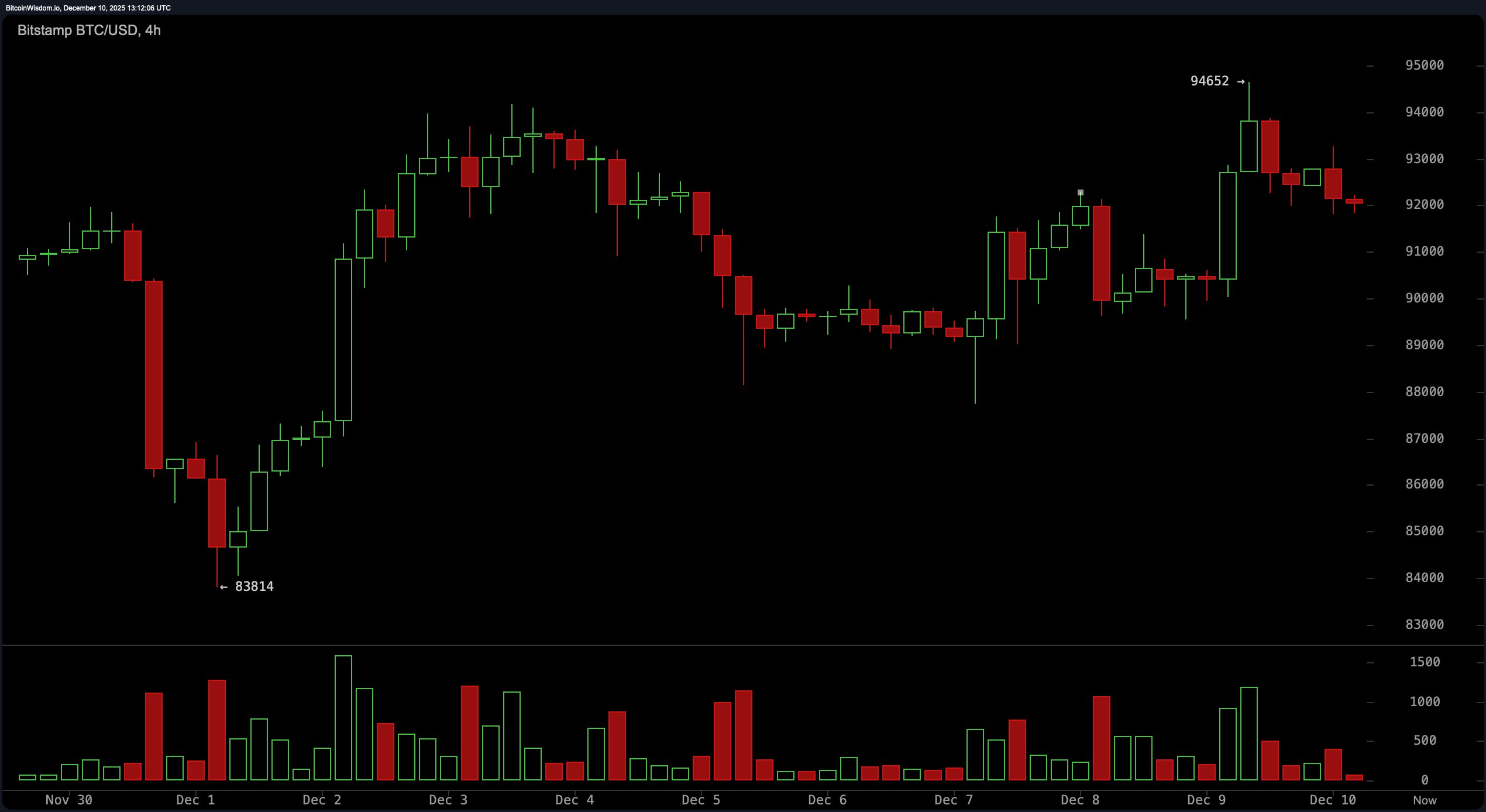2025年12月10日通过Bitstamp的BTC/USD 4小时图表。