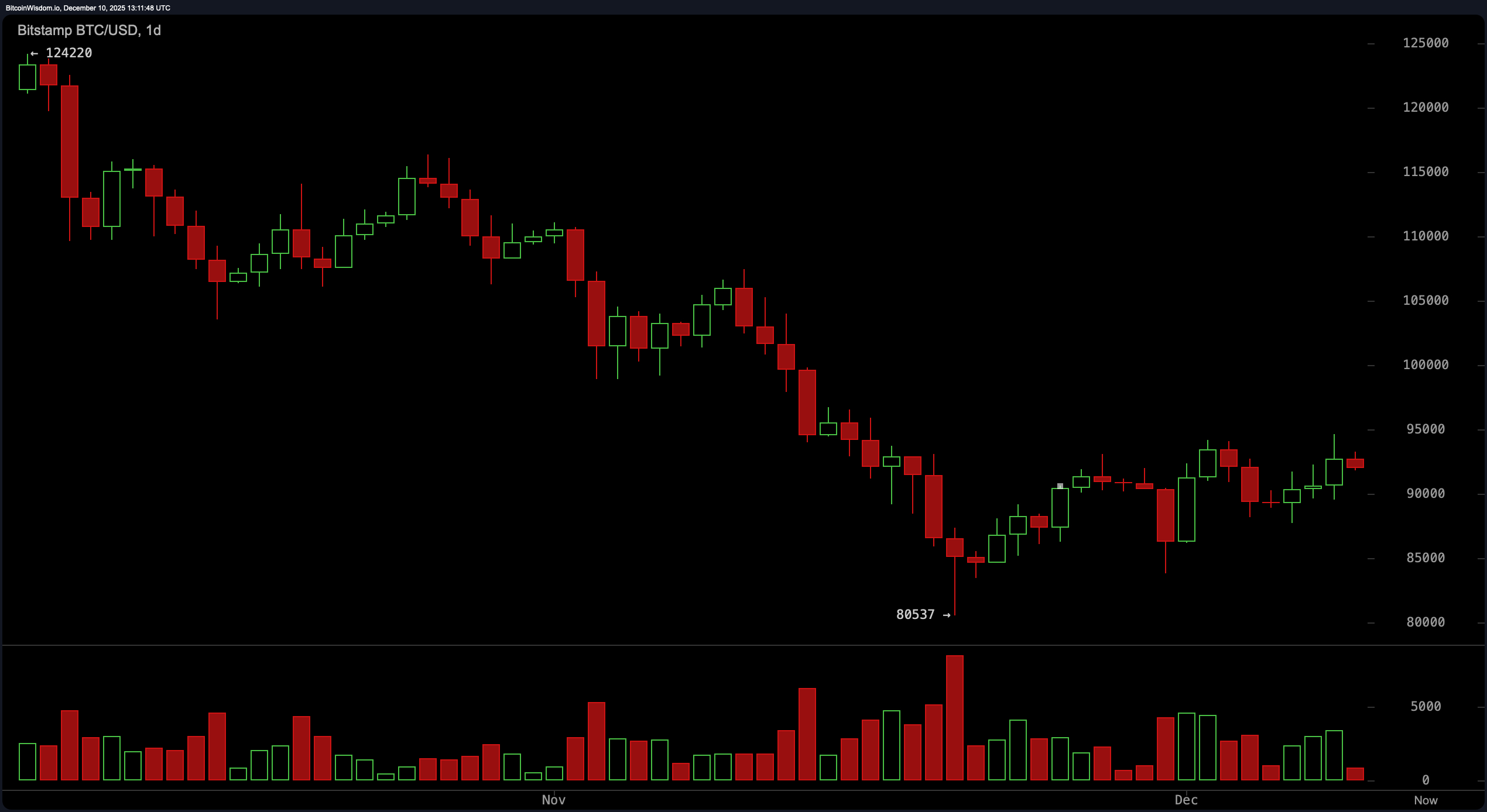2025年12月10日通过Bitstamp的BTC/USD 日线图表。