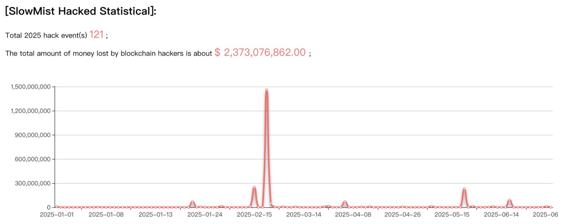This year's crypto attacks exhibit a new symmetry: the number of incidents is decreasing, but the destructiveness of each attack has significantly increased. SlowMist's mid-2025 report shows that the crypto industry encountered 121 security incidents in the first half of the year—down 45% from 223 in the same period last year. This should be good news, but the losses from attack incidents skyrocketed from $1.43 billion to approximately $2.37 billion, an increase of 66%.