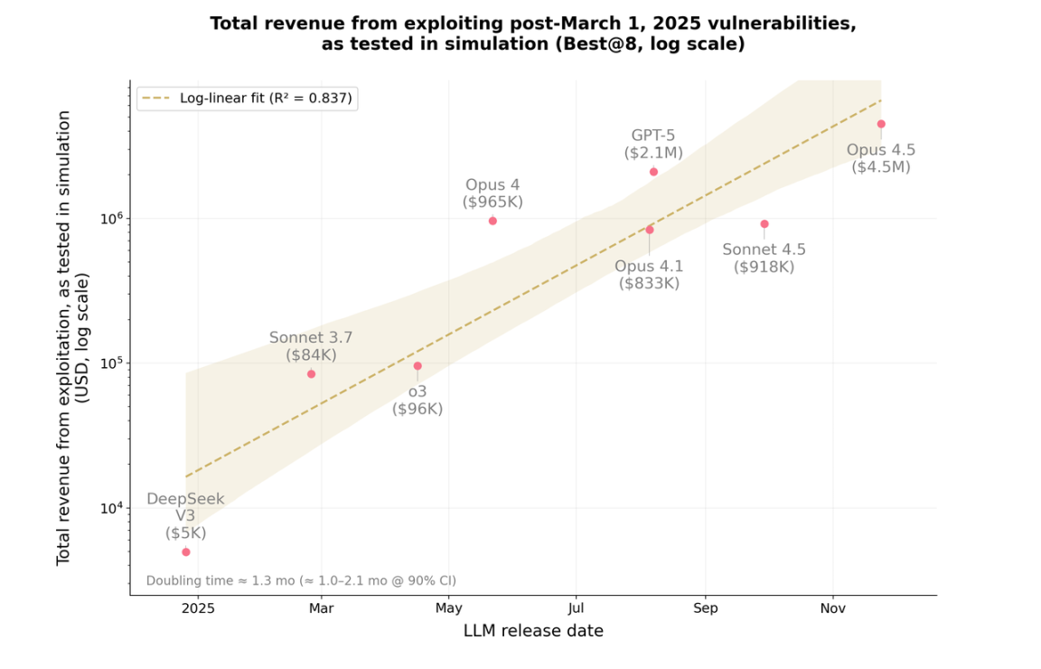 The same study also presents a more uncomfortable conclusion: in the 2025 sample, the "vulnerability mining returns" of AI double approximately every 1.3 months—this growth rate is an order of magnitude faster than Moore's Law. With rapid advancements in reasoning, tool invocation, and long-cycle task execution, defenders are clearly losing their time advantage.