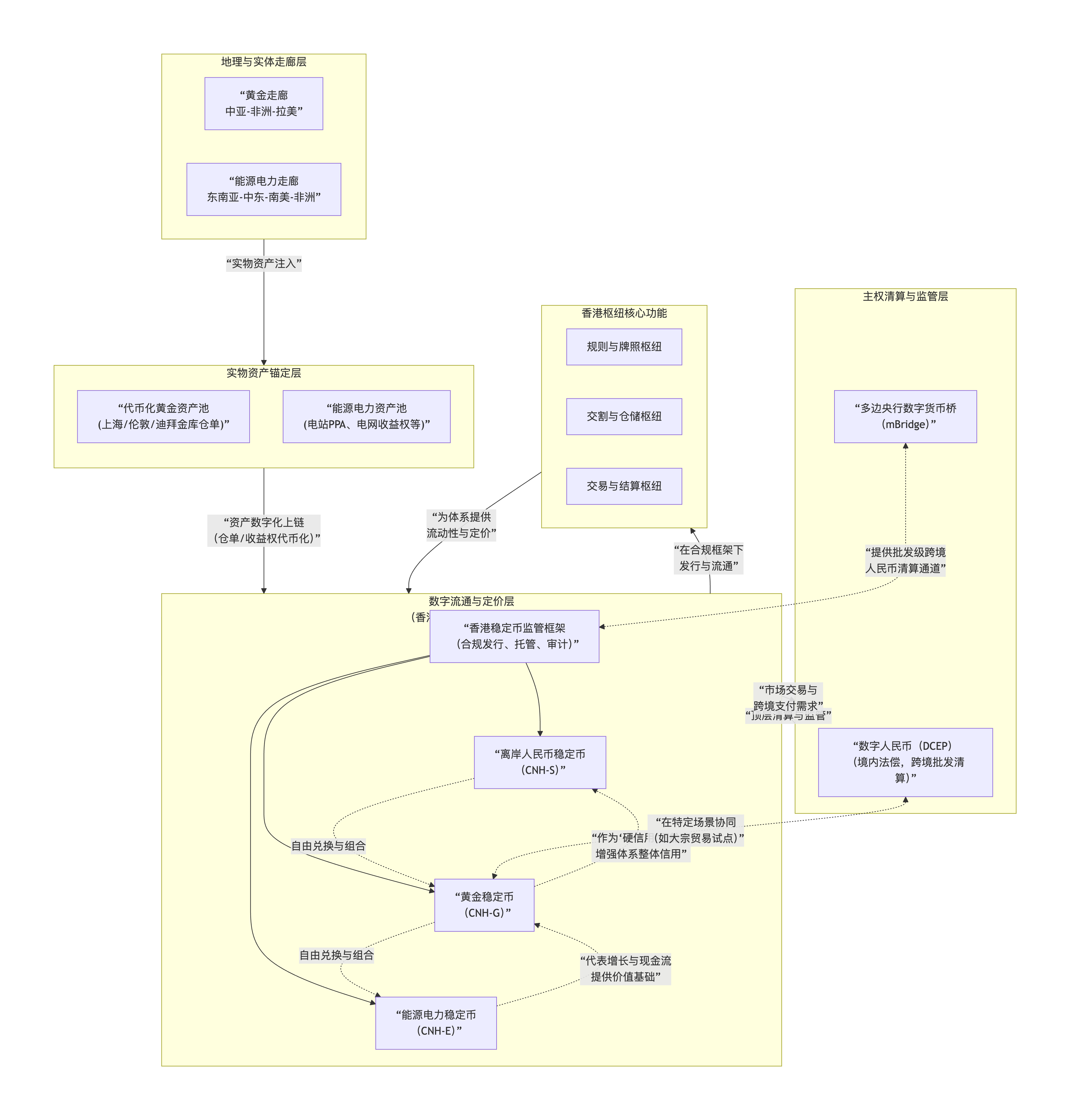 最底层,是资产锚定层:黄金走廊带来的实物黄金仓单,能源电力走廊带来的电站PPA和收益权,以及一部分高流动性的离岸人民币资产,一起构成资产池。