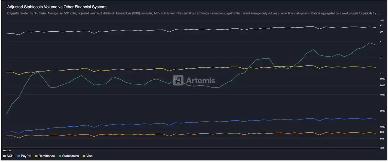 这一转变已在规模上显现。稳定币在不到十年的时间里,从几乎为零增长到约 3000 亿美元市值,并且在处理真实经济交易量方面,已超过传统支付网络(如 PayPal 和 Visa),即使排除交易所间转账和 MEV。首次出现了非银行、非卡片轨道在全球范围内真正运行。