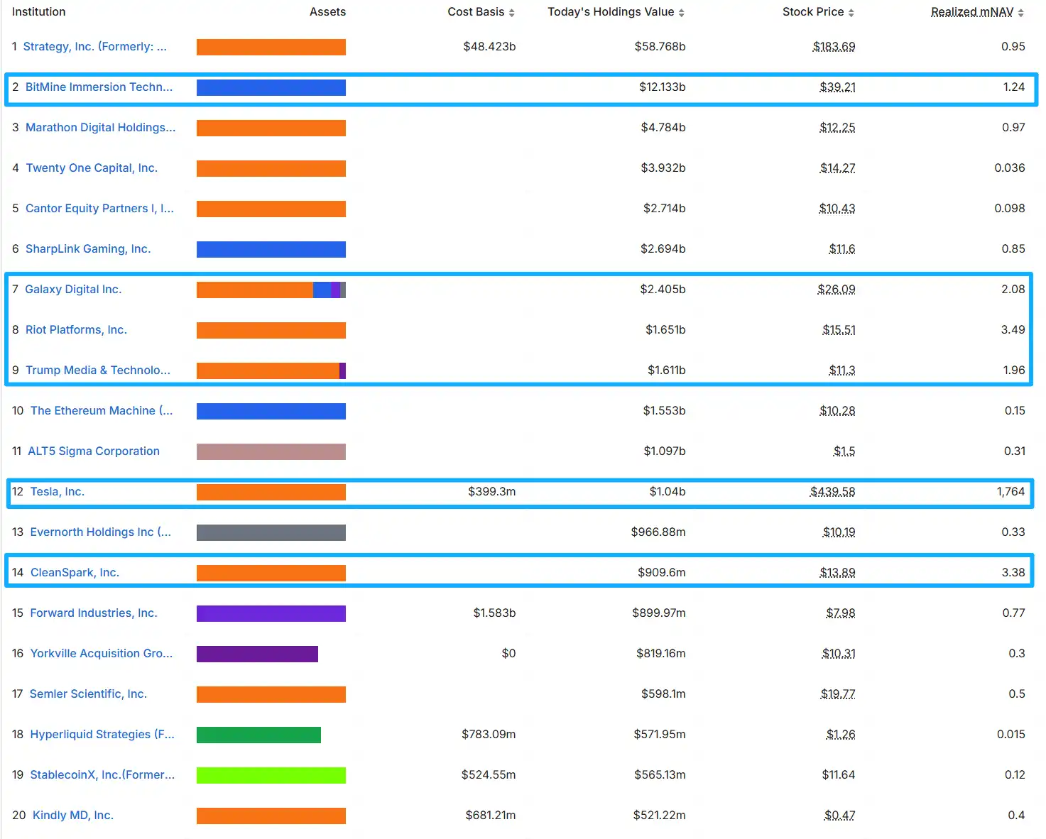 从行业层面看,Twenty One 的问题已经并非个案。据 defillama.com 数据,目前全球已有超过 70 家「币股公司」(即持有加密资产的上市公司)。在前 20 大持有者中,大多数公司的 mNAV 已跌破 1,包括开创该模式先河的 Strategy。