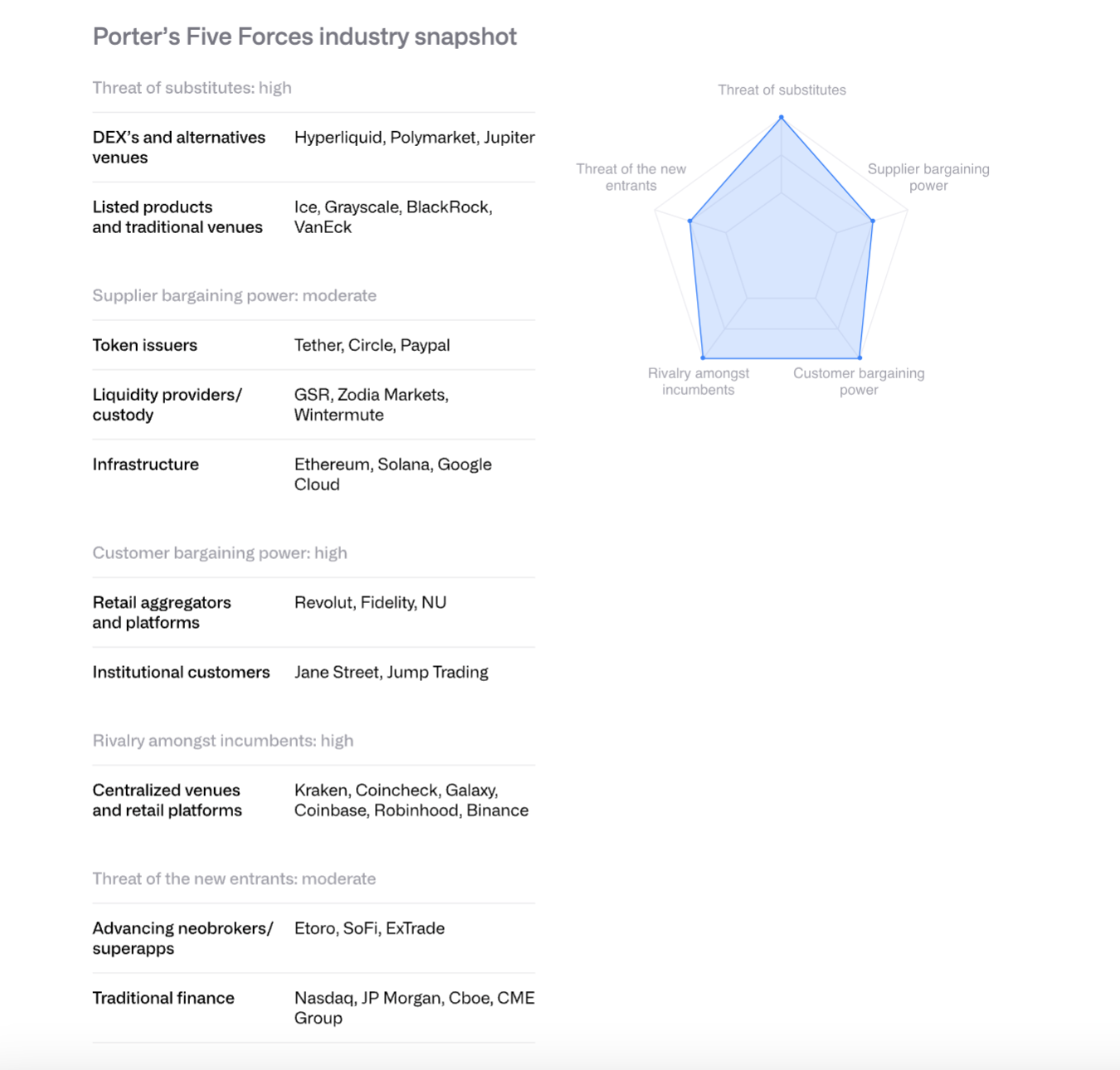 替代品威胁:Hyperliquid等去中心化交易所、Polymarket等预测市场、CME加密衍生品构成竞争。