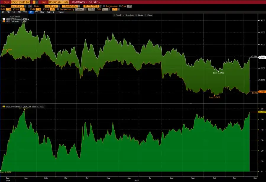 For ordinary investors, this indicator may seem a bit unfamiliar, but it is actually the most direct signal for the market to judge "who controls long-term interest rates." Recently, the spread between 12-month U.S. Treasury bonds and 10-year Treasury bonds has once again approached a phase high, and this round of increase is not due to an improving economy or rising inflation, but rather the market reassessing: what may determine long-term interest rates in the future is not the Federal Reserve, but the Treasury.