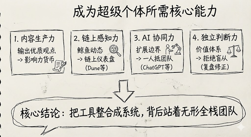 To become a super individual, multi-dimensional abilities are required, among which content productivity, on-chain perception, AI collaboration, and independent judgment are the most critical.
