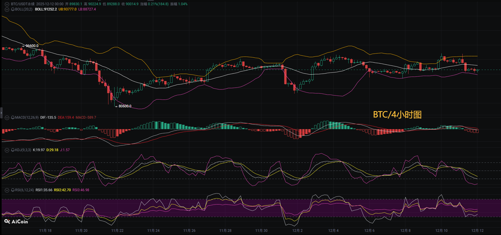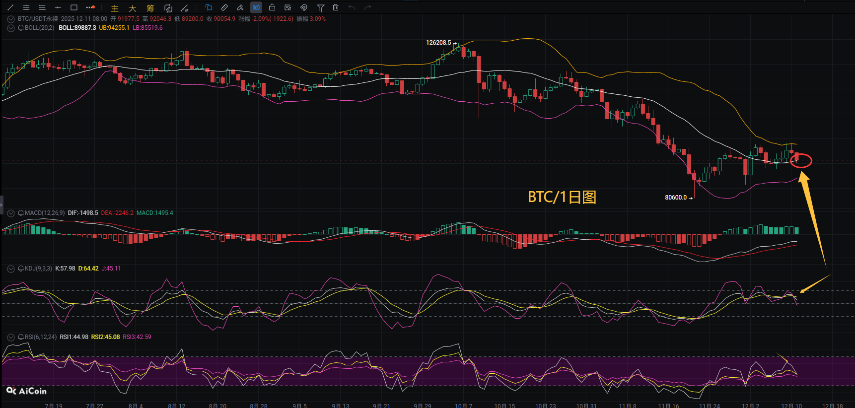Bitcoin's price has once again retraced during the day, and the short-term trend remains weak and volatile. The previous gains are being given back, but the key support level of 89000 has not been broken. The short-term oscillation pattern will not change. On the daily chart, the price is operating in the middle track area, and the market has entered a consolidation phase. However, the key support in the middle track has not been broken, and the short-term trend is in consolidation.