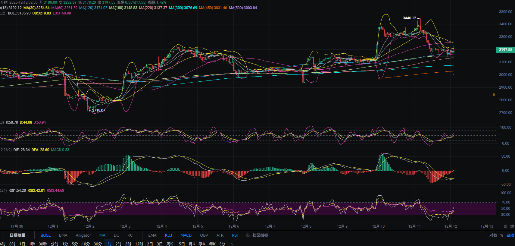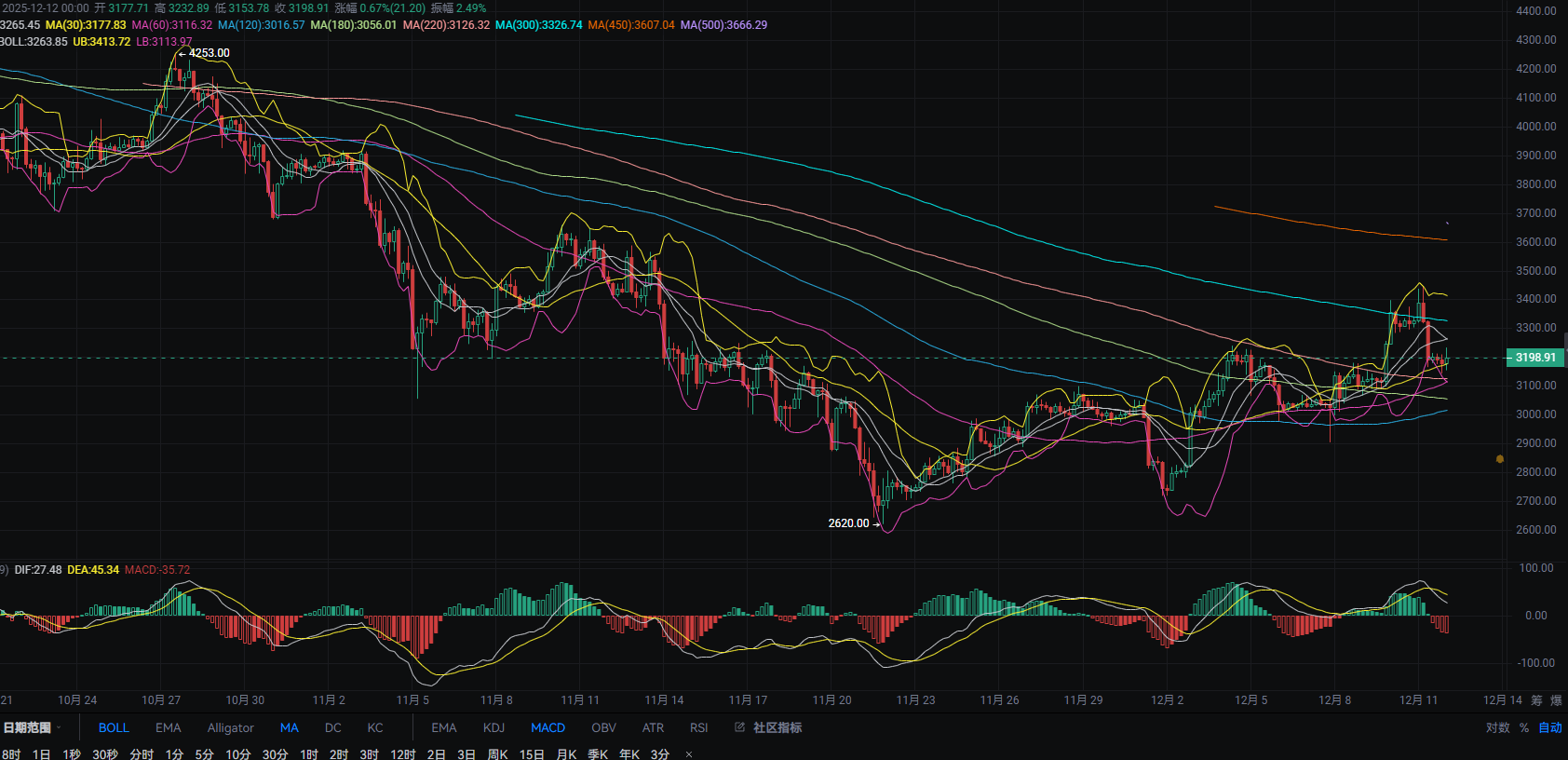 This position coincides with the pressure of the 4-hour mid-band and the MA15 crossover, making it a relatively good entry point for shorts. If the 4-hour mid-band is broken, it is necessary to defend above the MA300! From the 4-hour level, the Bollinger Bands are continuing downwards, with the lower band crossing below the MA220 and MA15 support points. Additionally, the MACD's fast and slow lines are diverging and continuing to approach the 0 axis. Lihui believes that after breaking 3100, it should adjust to the MA180 and MA120 range; if it holds, then consider entering short positions!