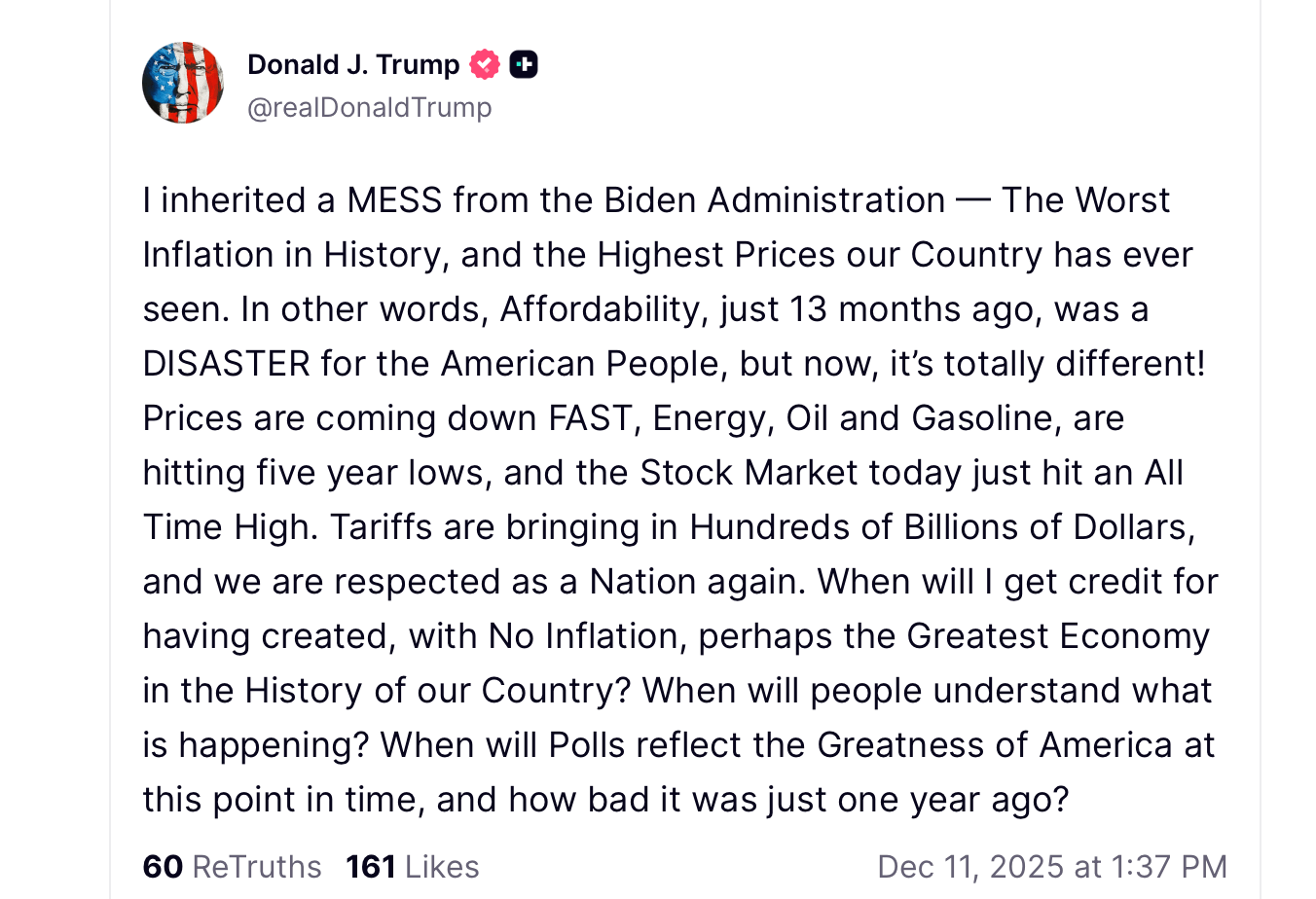 “股市刚刚创下历史新高!!!假民调什么时候才能显示我在经济等方面做得很好???谢谢!”