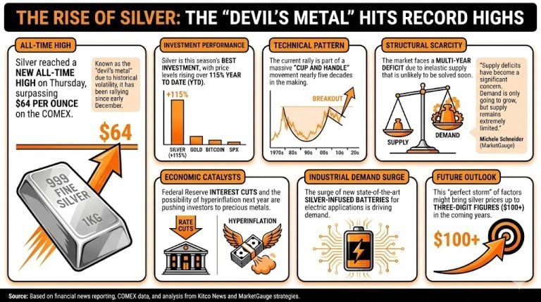 银,因其历史波动性被称为“魔鬼金属”,在周四达到了新的历史高点,超过了每盎司64美元。自去年12月初以来,这种金属一直在上涨,尽管分析师多次将其标记为超买,但仍然持续上升。