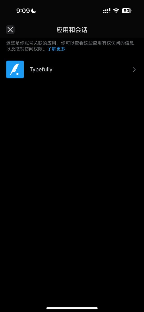 第二,减少第三方应用接入,如👇图,目前我只有一个Typefully做团队创作的协作任务,其他干干净净,该清理的清理掉。清理入口:设置与隐私——安全性和账号访问权限——应用和会话——已连接的应用——剔除连接。