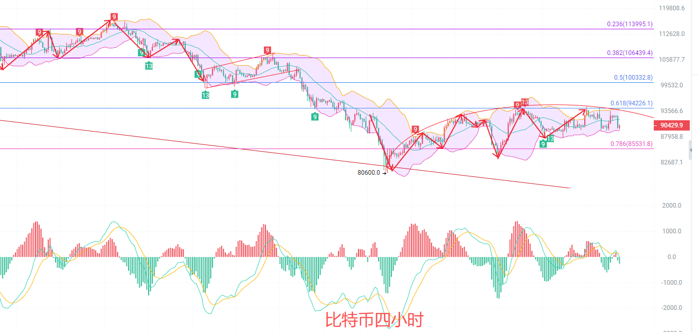 日K线发稿前最高92700,最低89400,日线目前的形态是盘整,上方顶部压力位在黄金分割线0.618一线,94200,那么下轨支撑在85500一线,这是中线级别的箱体,MACD放量上行,DIF和DEA冲击0轴线减速说明短线走南明显,布林带在收缩,行情大概率回到9万关口以后重新开始选择方向,上轨关注94000,下轨关注86500,主力目前在中轨90300横盘,稳健的币友可以好好休息一下,激进的币友等抵达中线压力或者支撑在入场最好,或者在9万关口南北双向开仓
