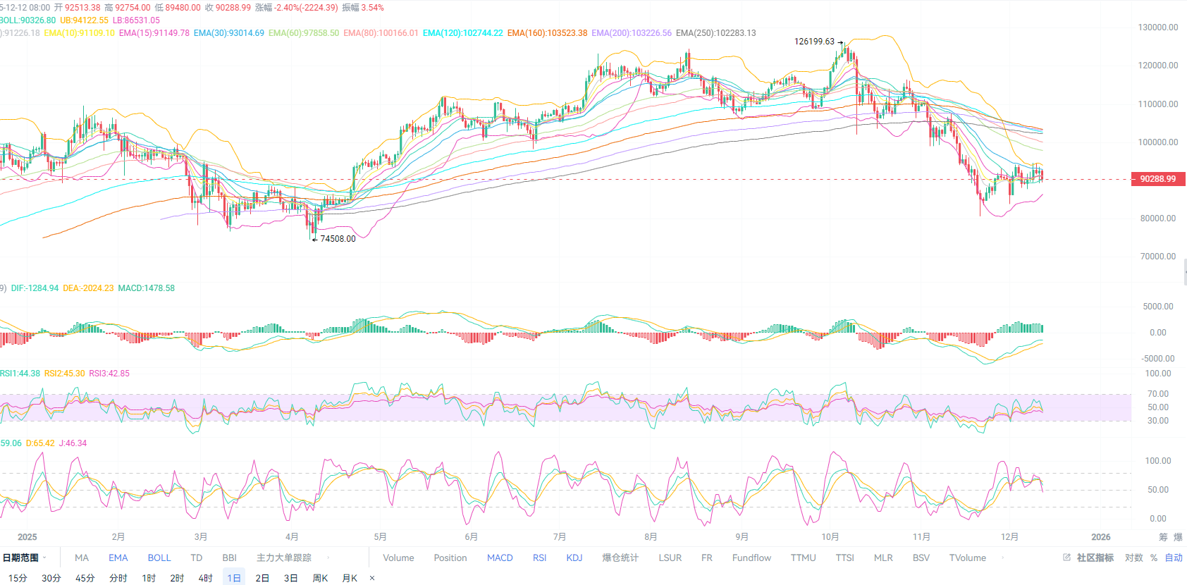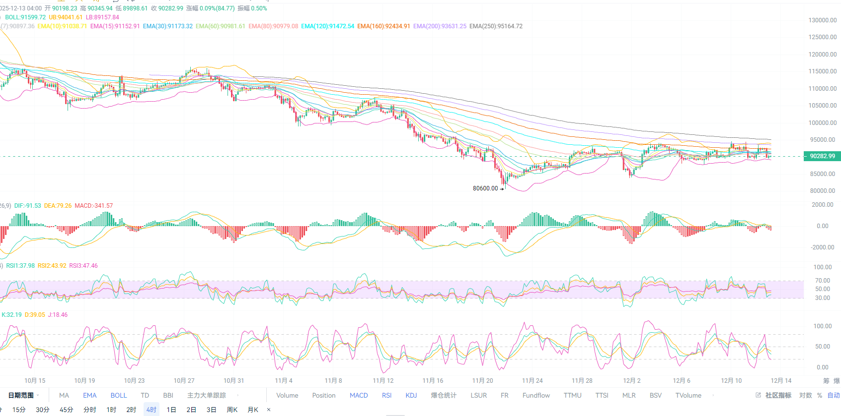 比特币现价90300附近,昨日凌晨大饼在4H图中强势拉回一波冲击EMA200与上轨重合位置再次走出回踩,这波空头回踩在预期之内,只是反弹有些许强意,整体思路还是没有问题的。目前k线再次走到下轨位置有意反转,但多头动能明显不足,就看短线超卖后的反弹力度,红姐建议日内先关注4小时中轨与EMA160区间承压选择空单入场,目前BOLL下轨是存在继续向下扩展的,MACD中红柱也在继续放量,DIF与DEA从金叉扳回死叉开口继续,KDJ三线向下接近15,目前还未走入超卖区,说明下方空间还未走完,看来下轨位置是必破的,有打破连日震荡低点支撑。