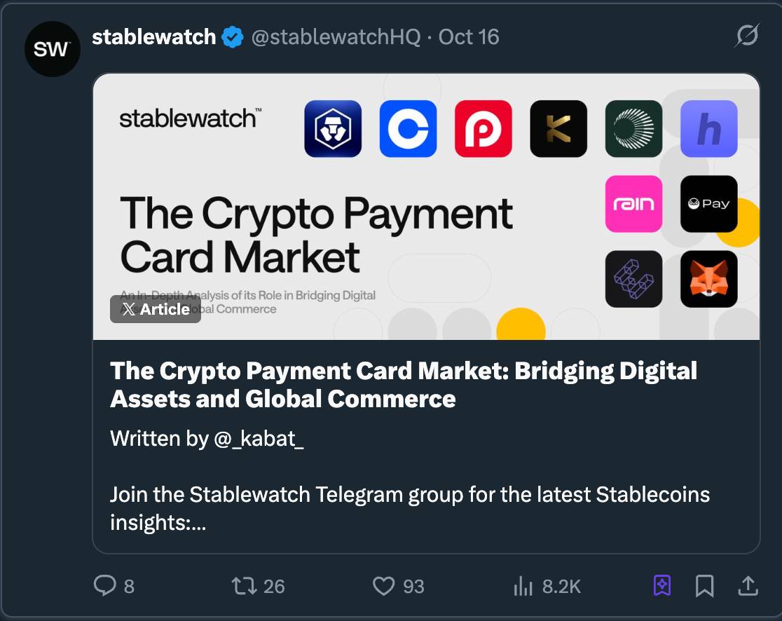 @stablewatchHQ 对这种桥接机制进行了深入分析,将其本质上定义为一种“卡片即服务”(Card-as-a-Service,CaaS)模式。这是许多人讨论加密卡片时最容易忽视的一个关键点。这些 CaaS 平台提供了发行自有品牌卡片的基础设施。