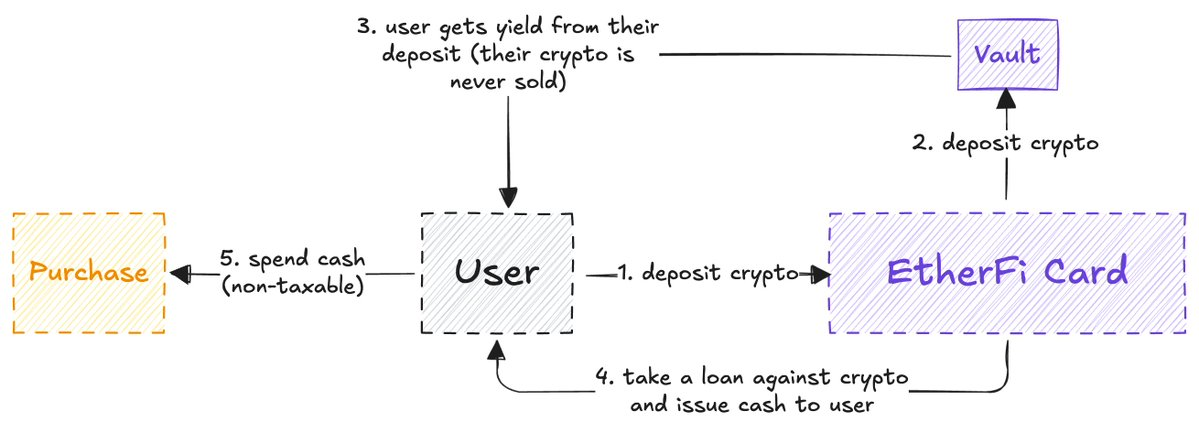 而 EtherFi 不同: 它从不出售你的加密货币,而是以你的加密货币作为抵押,给你提供现金贷款,同时利用你的加密资产赚取收益。