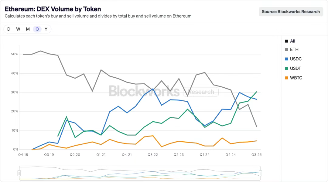 Within the Ethereum ecosystem, there are signs that stablecoins are gradually replacing ETH. Liquidity is migrating on-chain with Perp DEX, and USDT/USDC are profoundly changing the old patterns. The story of stablecoins replacing ETH/BTC as benchmark assets within CEX is set to be replayed on-chain.