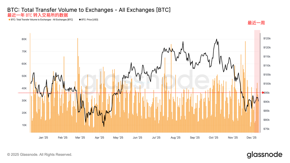 从更细节一点的交易所流量数据来看,如果转入交易所的 BTC 数量视为投资者恐慌情绪的话,我们能看到最近三周投资者的恐慌情绪在发生好转,每周转入交易所的数据都在下降,最近三周都保持比较稳定的状态。
