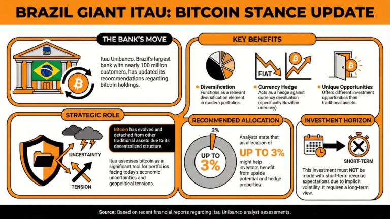 伊塔乌联合银行现在将比特币视为一种多元化工具和对抗货币贬值的对冲手段,建议在投资组合中配置最多3%