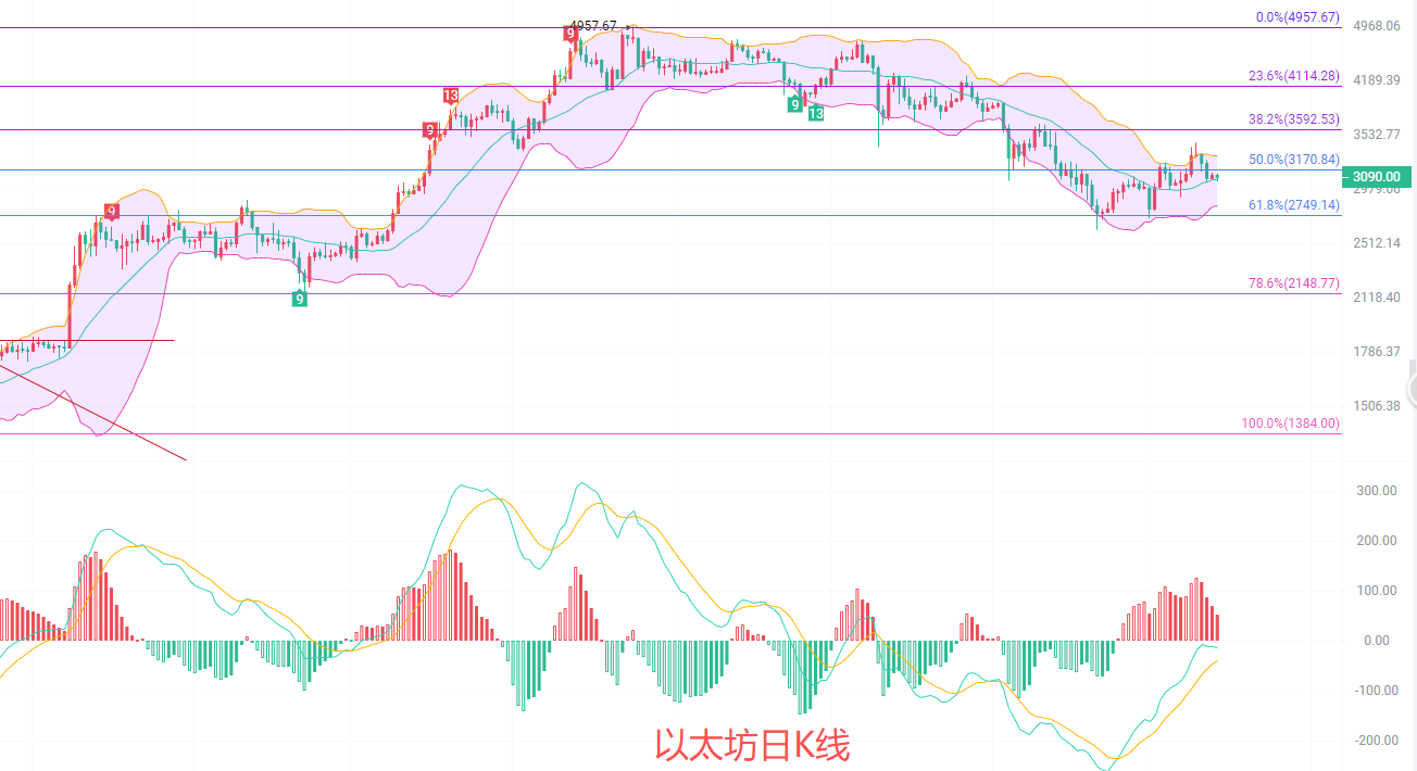 Before the article was published, the highest price was 3128, and the lowest was 3048. The EMA trend indicator shows a widening gap between the short and long periods, indicating increased volatility. The EMA15 short-term resistance level is still in place, and the next target remains the 3170 golden ratio resistance level. The MACD volume has decreased, and both the DIF and DEA have been consolidating below the 0 axis. Additionally, the daily K-line has stood at the Bollinger Band's middle line of 3076 for three consecutive days, indicating a demand for a rebound. The upper track is at 3317, and the lower track is at 2835.