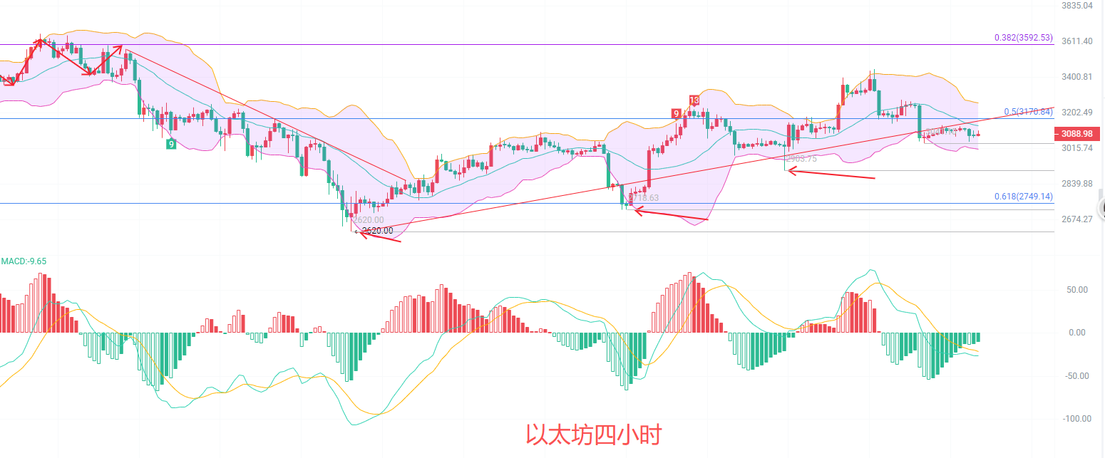 The four-hour K-line shows more pronounced behavior. The EMA trend indicator is still in a contraction phase, with the top resistance level at 3170 unchanged. The MACD has locked in a decrease, and the K-line shows an upward demand. The DIF and DEA are also contracting at the bottom. The Bollinger Band's middle line is at 3135, the upper track at 3255, and the lower track for defense at 3011. This indicates that there is strong support below 3050, so there is no need to overthink; just ensure good defense and proceed confidently.