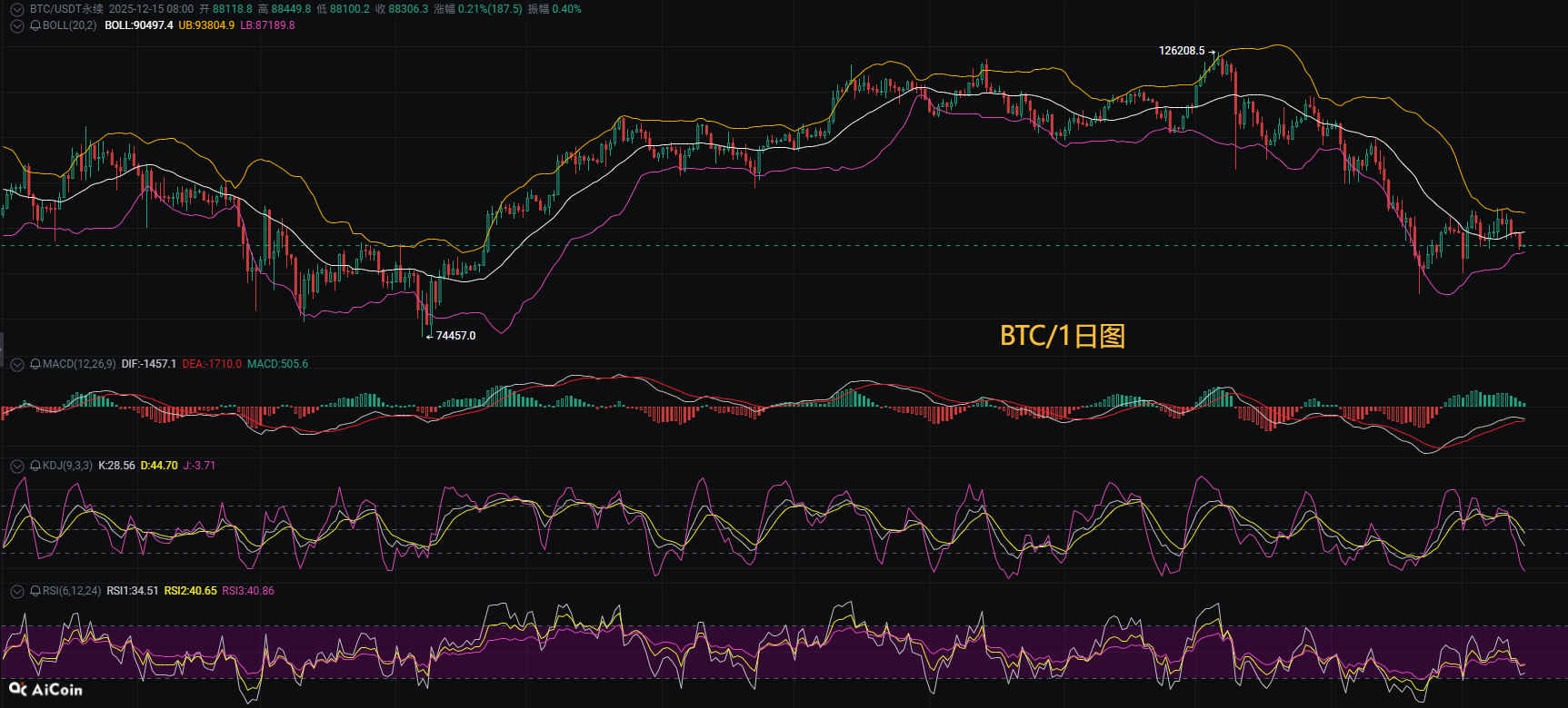 4小时级别MACD的DIF与DEA双线已下穿零轴,且柱状体持续扩大至-405,表明空头动能正在加速增强。与此同时,价格已全面跌破EMA7(89253)、EMA30及EMA120均线,当前最新低位位于88588的价位明显低于短期EMA7,呈现标准的多周期空头排列格局,短线趋势还是较弱,上行力度在逐渐减弱,后续预计回调将会延续,所以暂时操作不建议做多,稳健等反弹入场。上方压制关注9万区域,下方支撑关注新低(87500)破位关注85000,