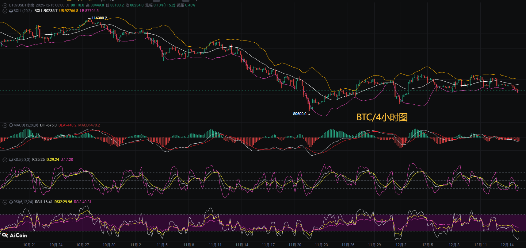 日内日内行情是延续弱势震荡走出下探,相比整体来看,走势还是偏弱,所以我们日内要谨防价格破位进一步向下试探,造成日线级别跌势的延续。在日线级别连续三根阴线跌破前低90229点,形成下降N字结构后,4小时级别出现显著异动,单根K线急跌896点并伴随成交量放大,释放出明确的短期抛压信号。从技术指标来看,