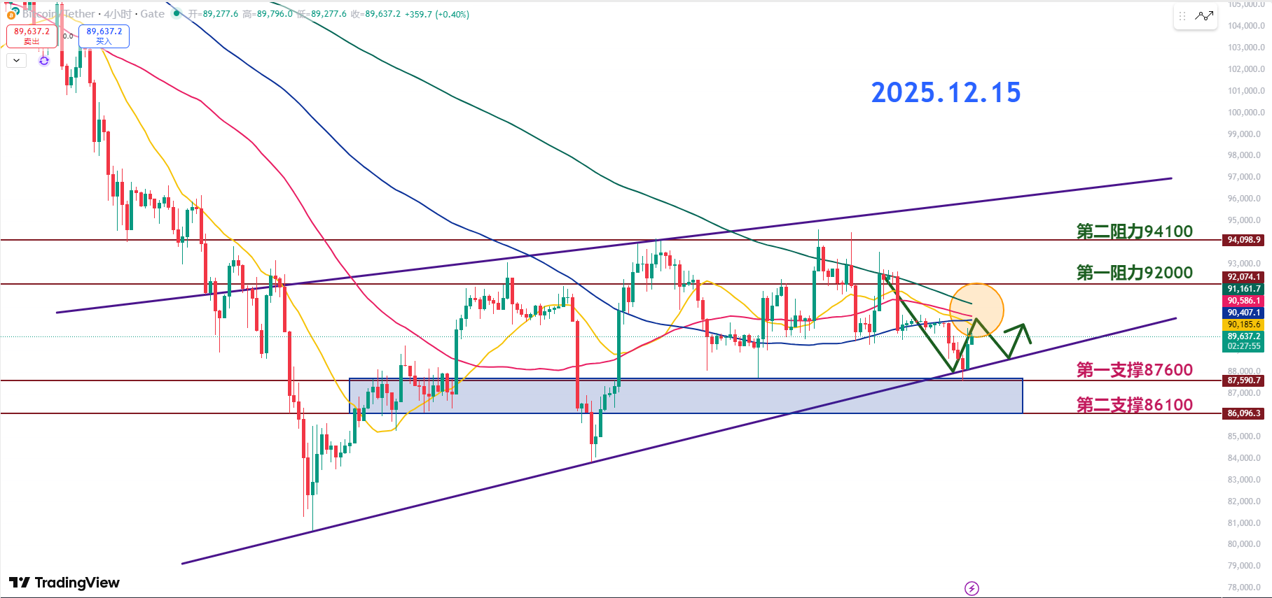 这两个位置是拿来算盈亏比的,不是让你无脑死扛的。如果下方趋势线被打穿,那就只能指望86K这一线硬抗了。
