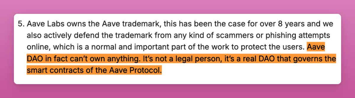 - “The front-end interface is operated by Aave Labs, completely independent of the management of the protocol and DAO.”