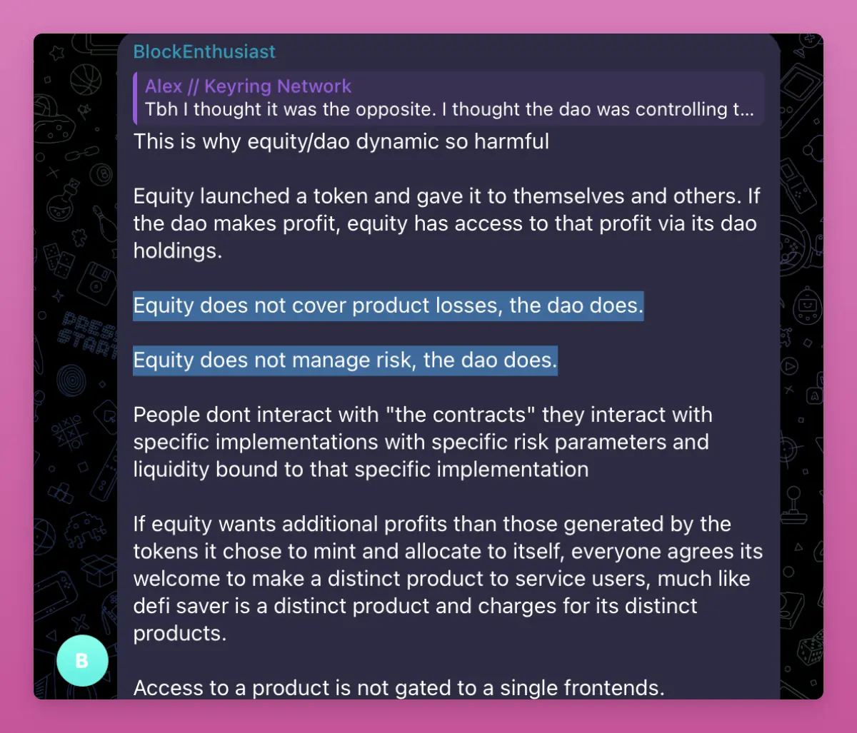 This is why equity/DAO dynamics can cause harm (as I discovered from the TG group chat).