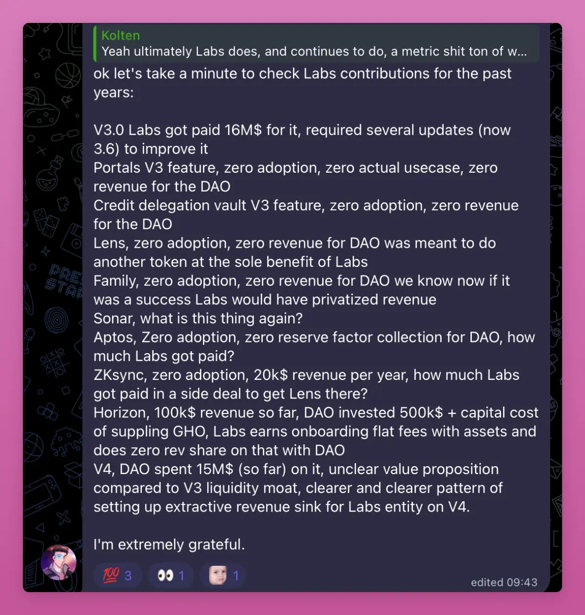 - “It is completely fine for Aave Labs to profit from its products, especially since they do not involve the protocol itself.”