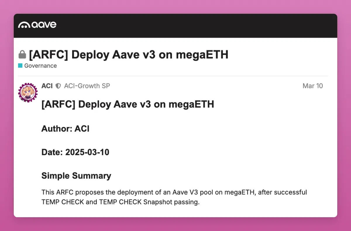 Aave DAO had already proposed deploying on MegaETH in collaboration with several service providers, especially ACI, as early as March. Relevant discussions are still ongoing.