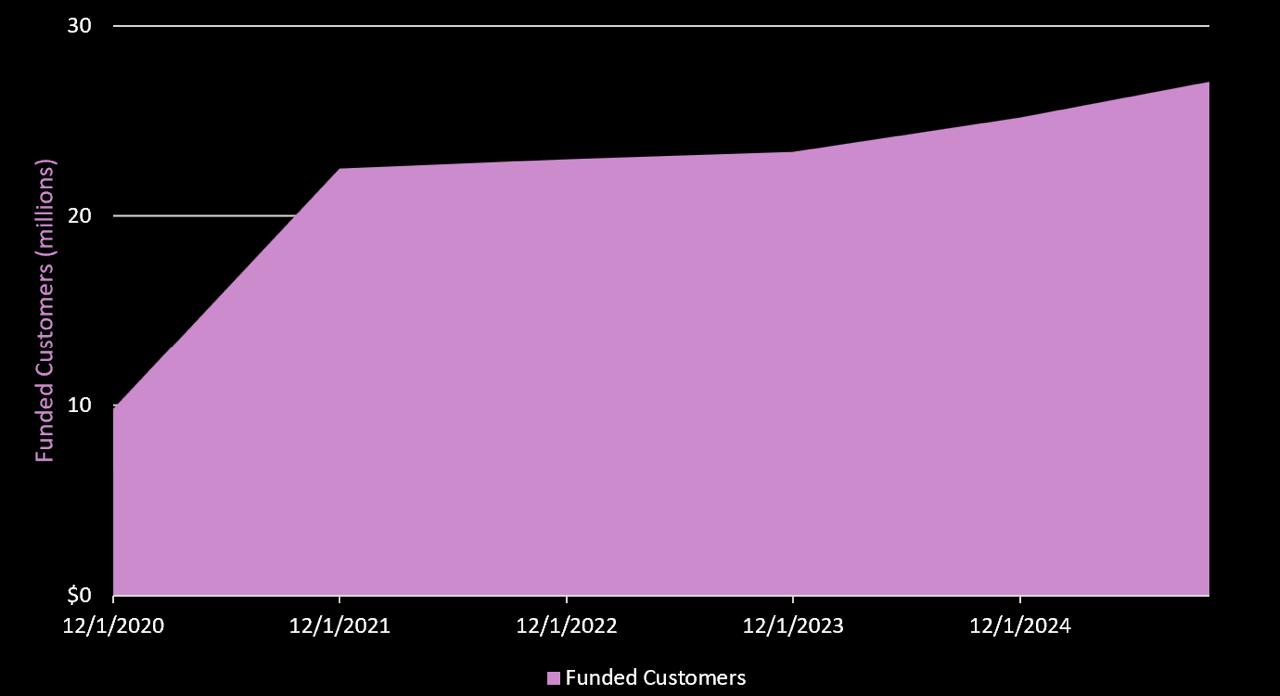As of September 30, 2025, Robinhood has 27.1 million paying users. The user growth rate over the past five years is 22.6%, with most growth occurring in 2020.
